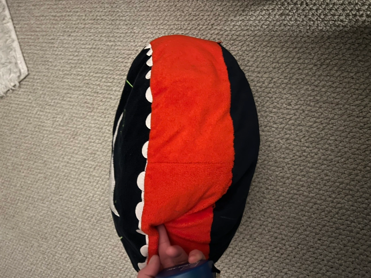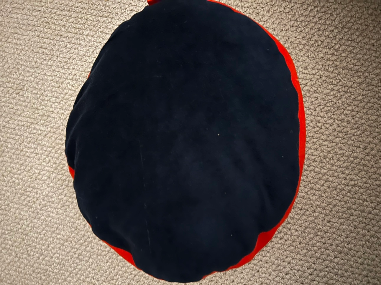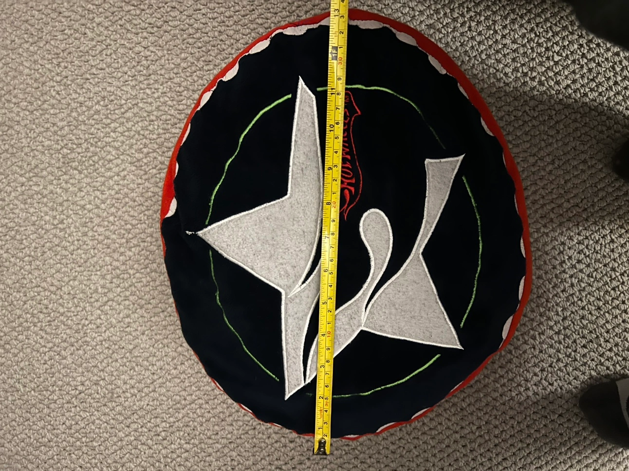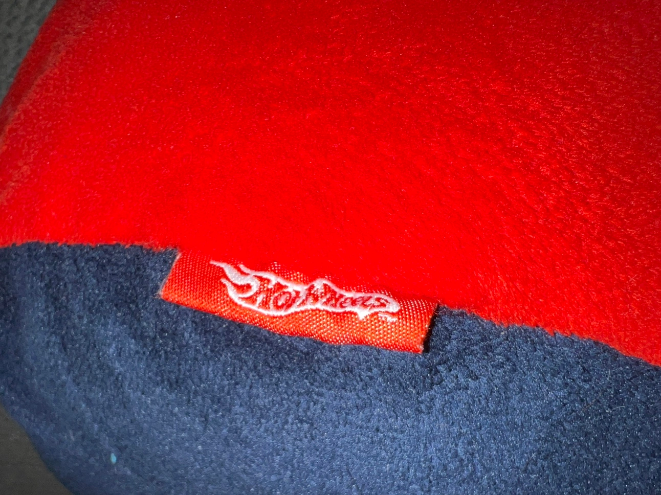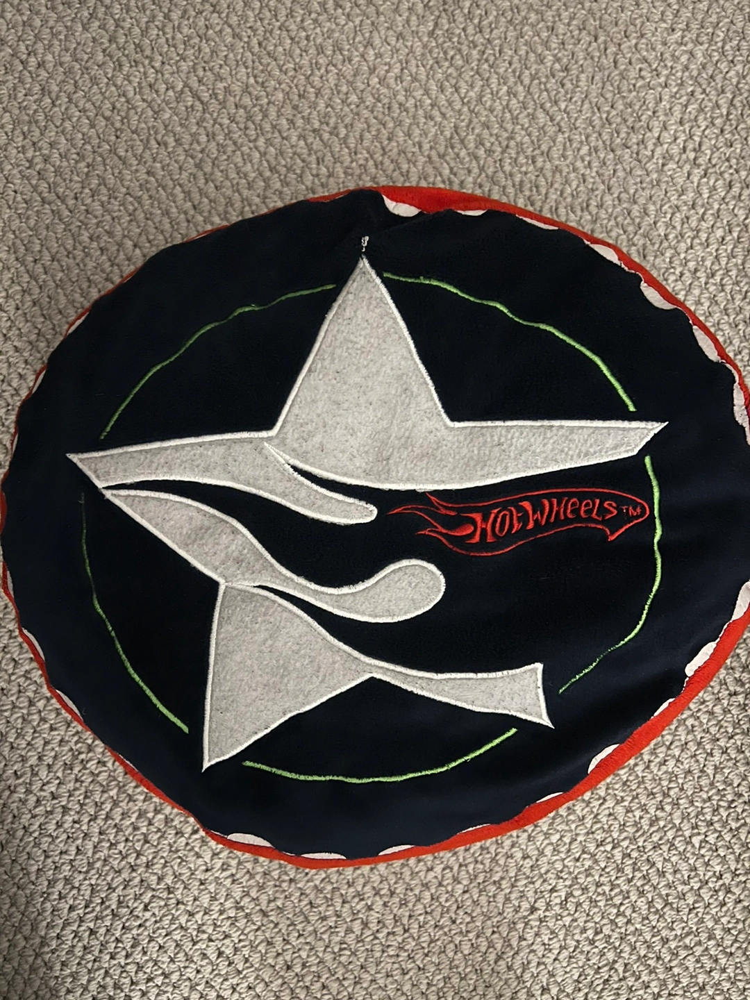 Round pillow with a Hot Wheels logo on the front. The cushion is blue with a red trim and a white star with the Hot Wheels logo on the front. The cushion is about 17 inches across.