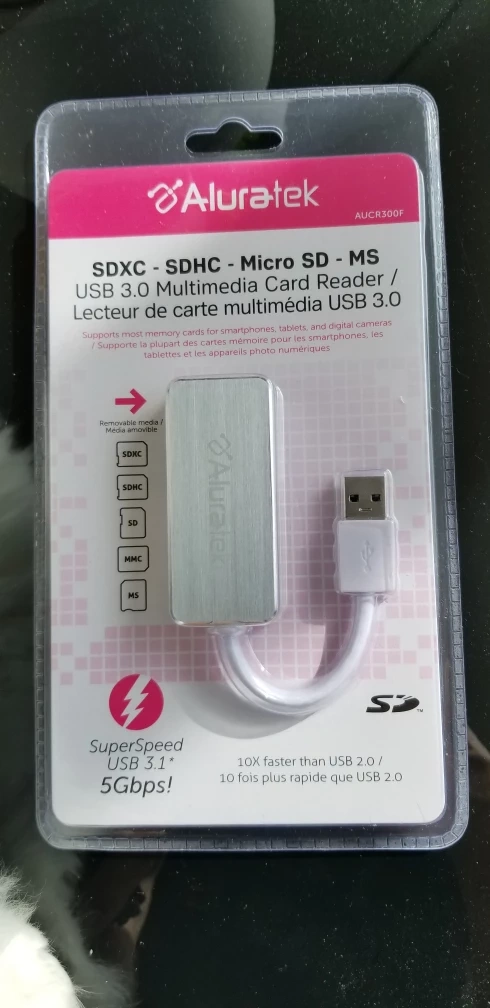 This card reader supports SDXC, SDHC, Micro SD, and MS cards. It has a USB 3.1 connector with speeds up to 5 Gbps. The device is compatible with most smartphones, tablets, and digital cameras.