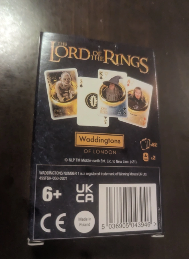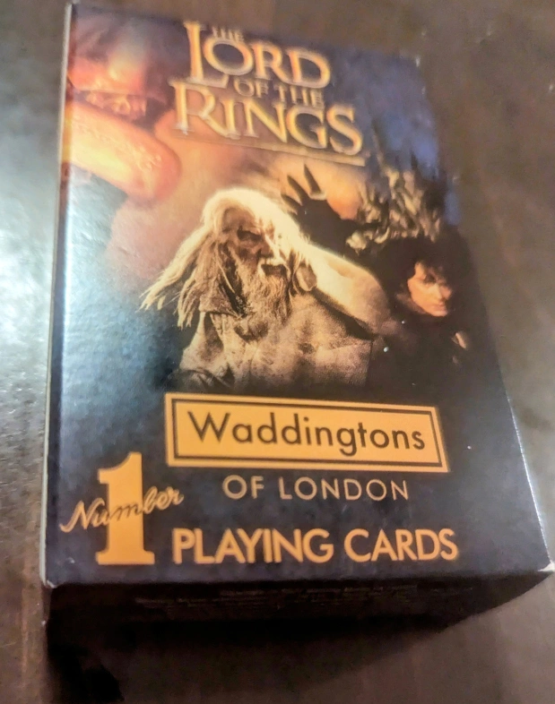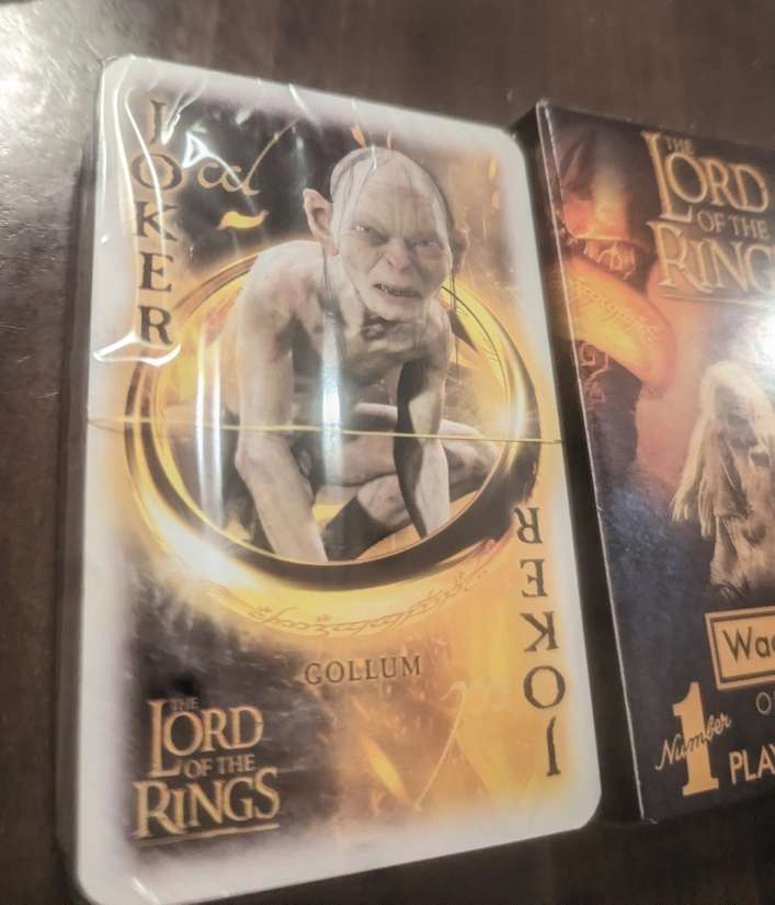 A deck of playing cards with a Lord of the Rings theme. They are in a box. The cards feature characters from the movies, such as Gandalf, Frodo, and Gollum. By Waddingtons of London. 52 cards 2 joker cards Gollum. Condition: New Unopened Pack.