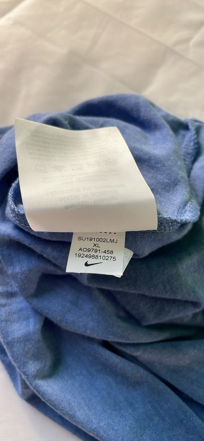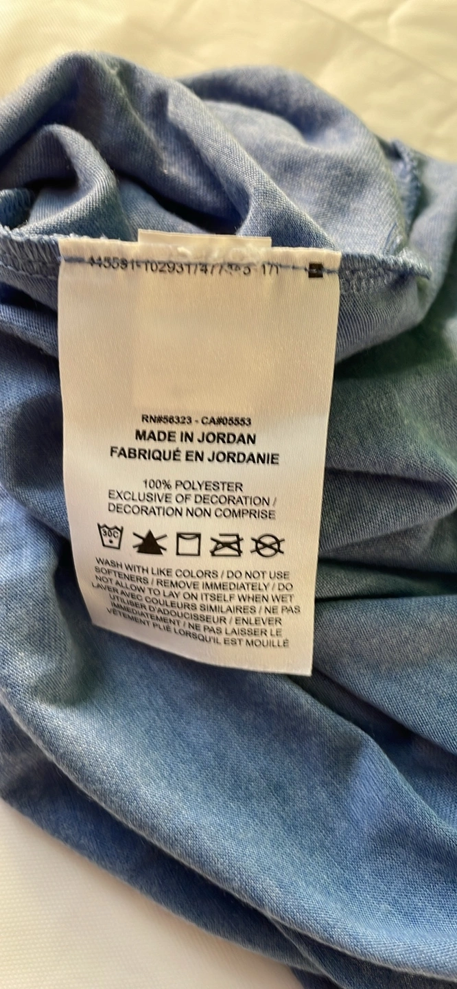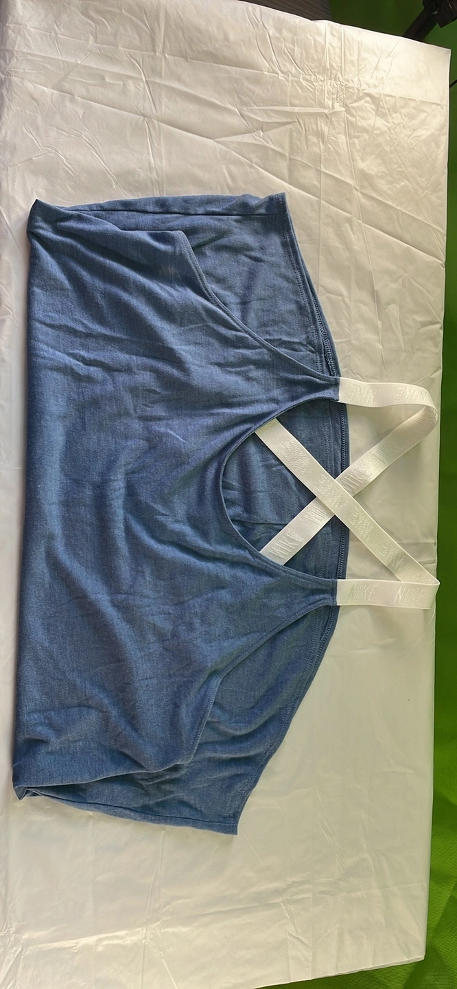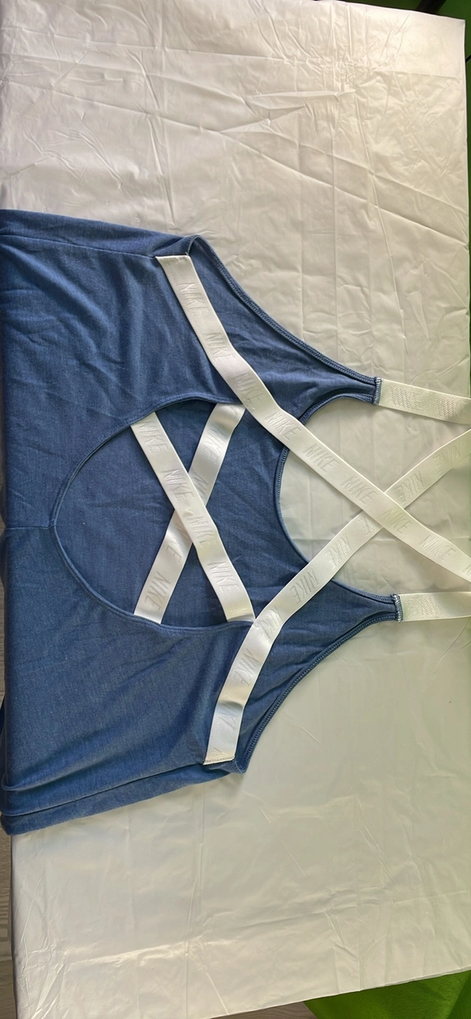 Blue tank top with white straps in the back. Size XL. 100% Polyester. Made in Jordan. New without tags.