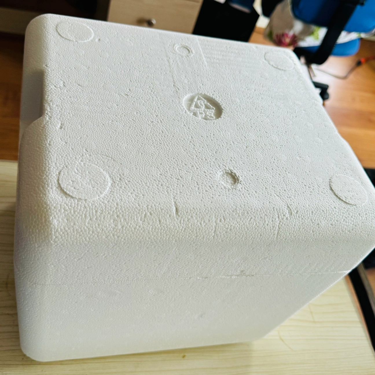 The cooler is in good condition. It is a white, styrofoam cooler. The cooler is square and has a hinged lid. It has the following dimensions: 10 inches in length, 10 inches in width, and 10 inches in height. The cooler comes with eight reusable cold packs. They are purple and in good condition. They are about 6 inches in length, 3 inches in width, and 1/2 inch in height. The packs are made by KoolIt.