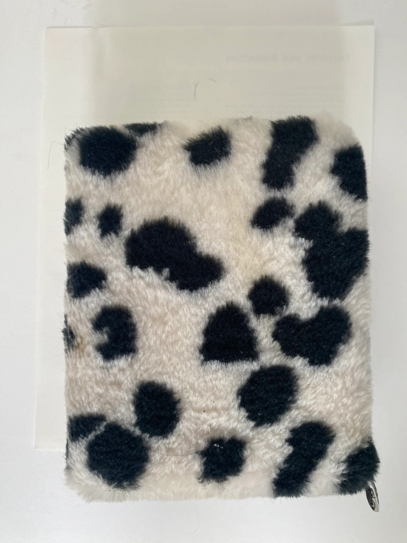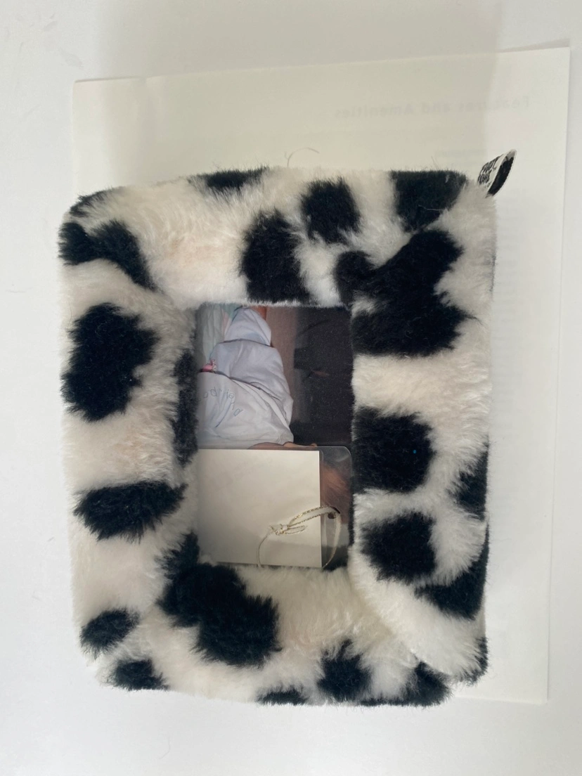 A small photo frame with a cow print design. It is made of a soft, fuzzy fur material.
