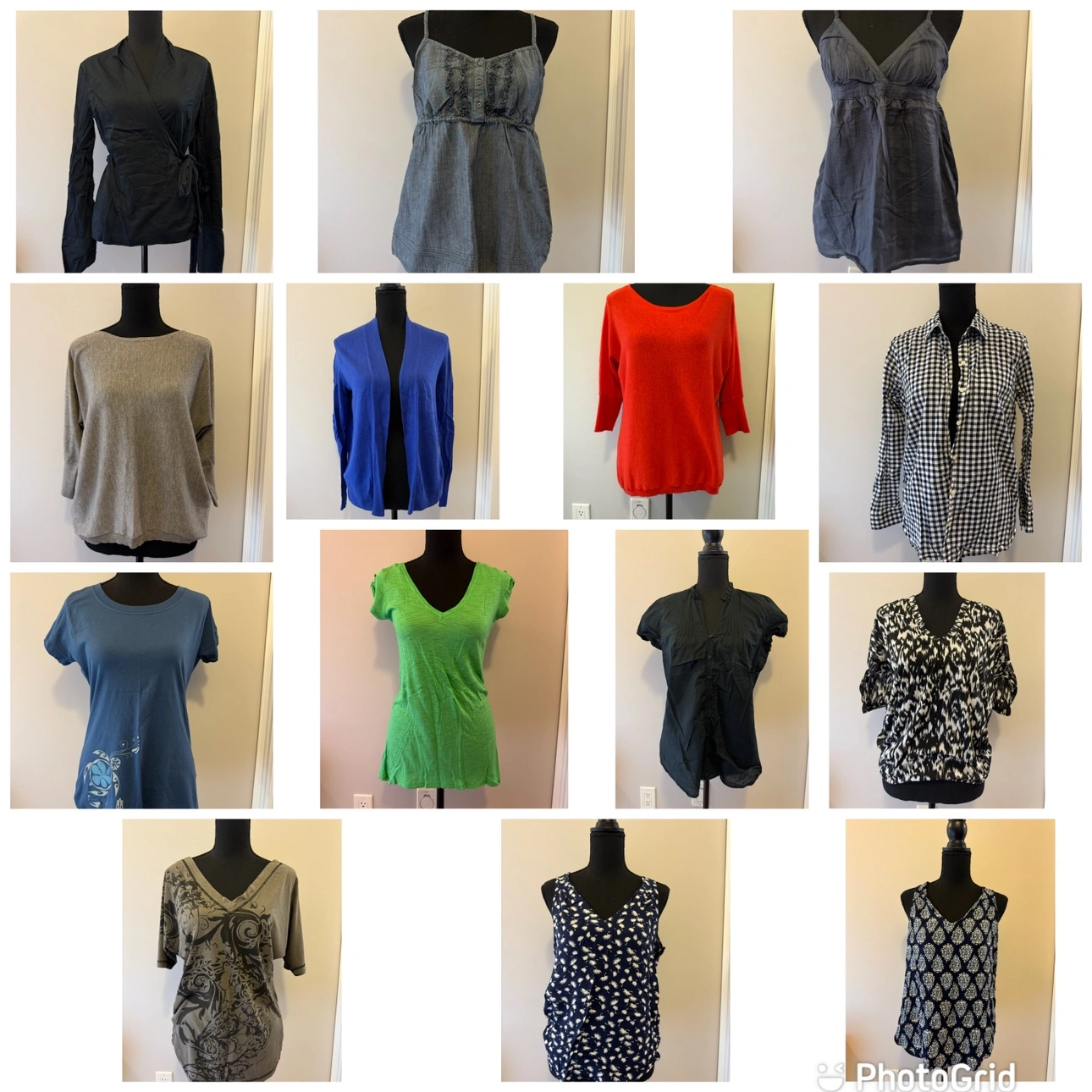 Various brand clothing in EUC/VGUC. Some tops have been washed but never worn and stored. First pic shows all clothes combined. Subsequent pics show better closeup. Entire 14-pc lot for $20 Danforth/Main Brands: Old Navy, Esprit, Express, Banana Republic, Aerie, Roxy, Jacob