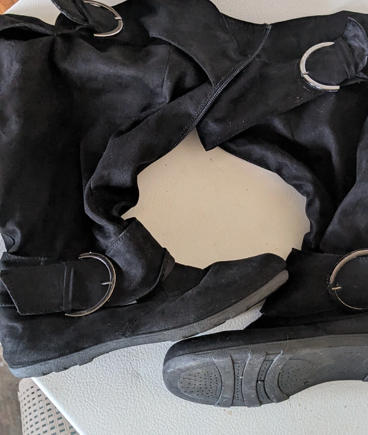 Black suede knee-high boots with buckle detail. One boot has a zipper up the back. The other boot has a buckle detail at the front. Boots have a wedge heel.