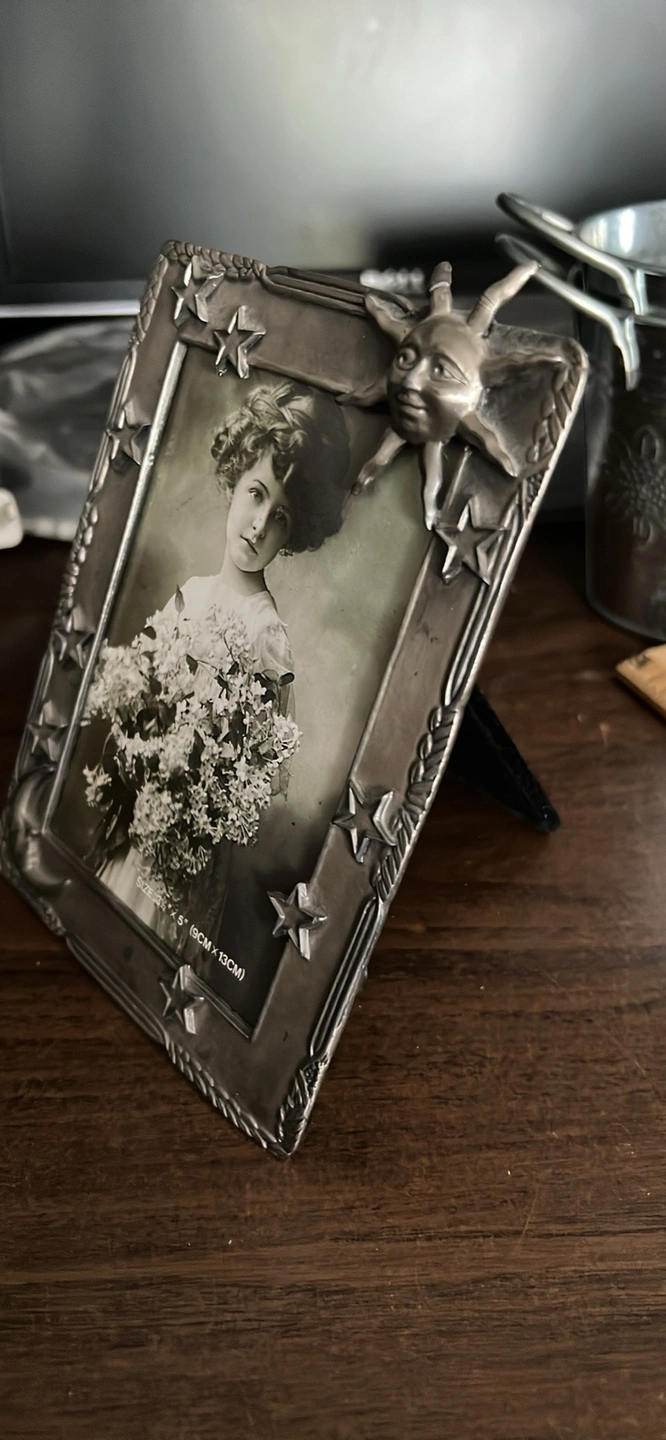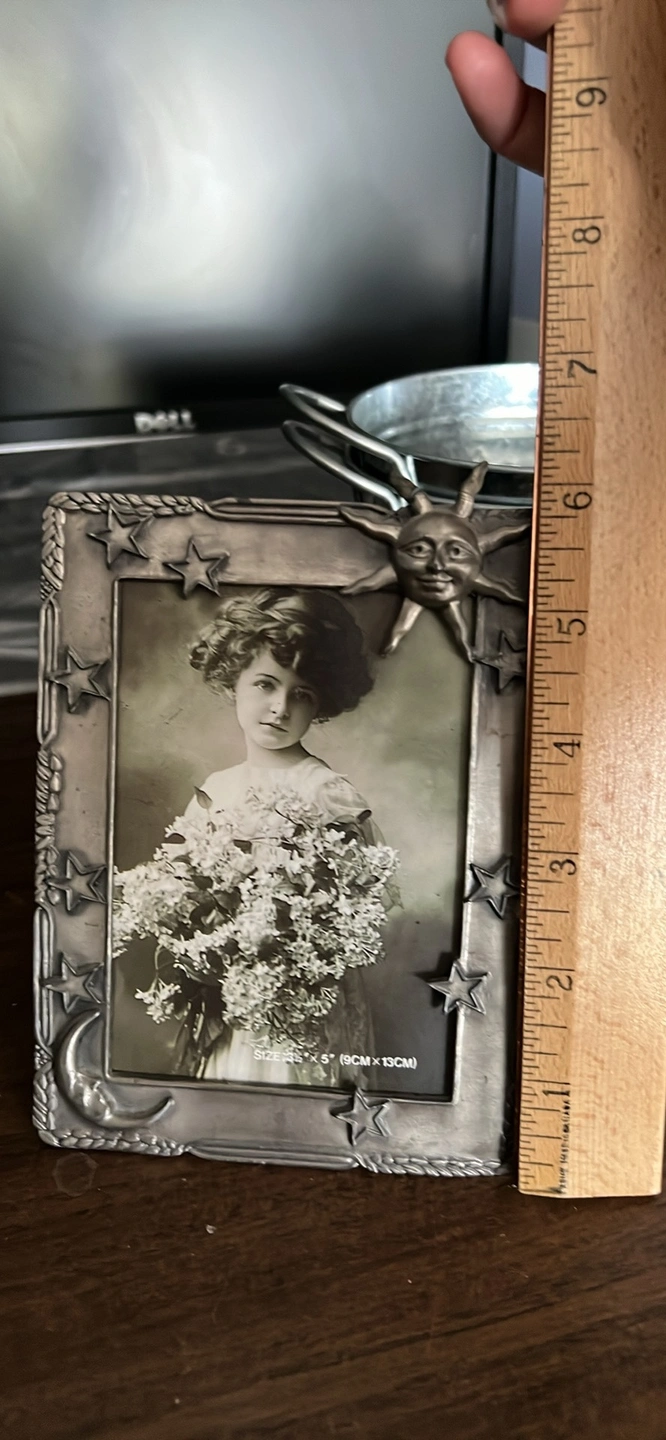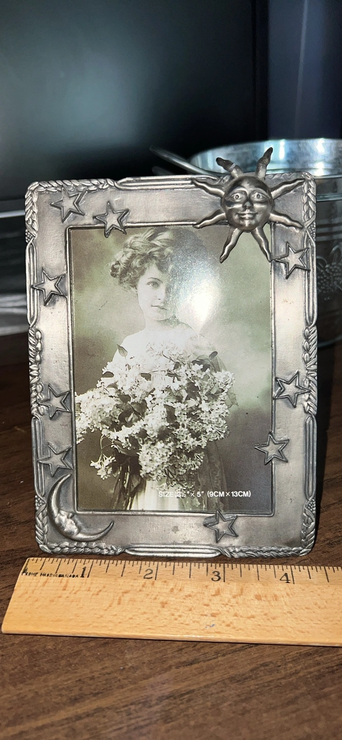 This is a silver tone photo frame with a sun and moon design. It is in good condition, but there are some scratches on the frame. It comes with a stand. The frame is approximately 5" x 6" (9 cm x 13 cm) and fits a 3.5" x 5" (8.9 cm x 12.7 cm) photo.