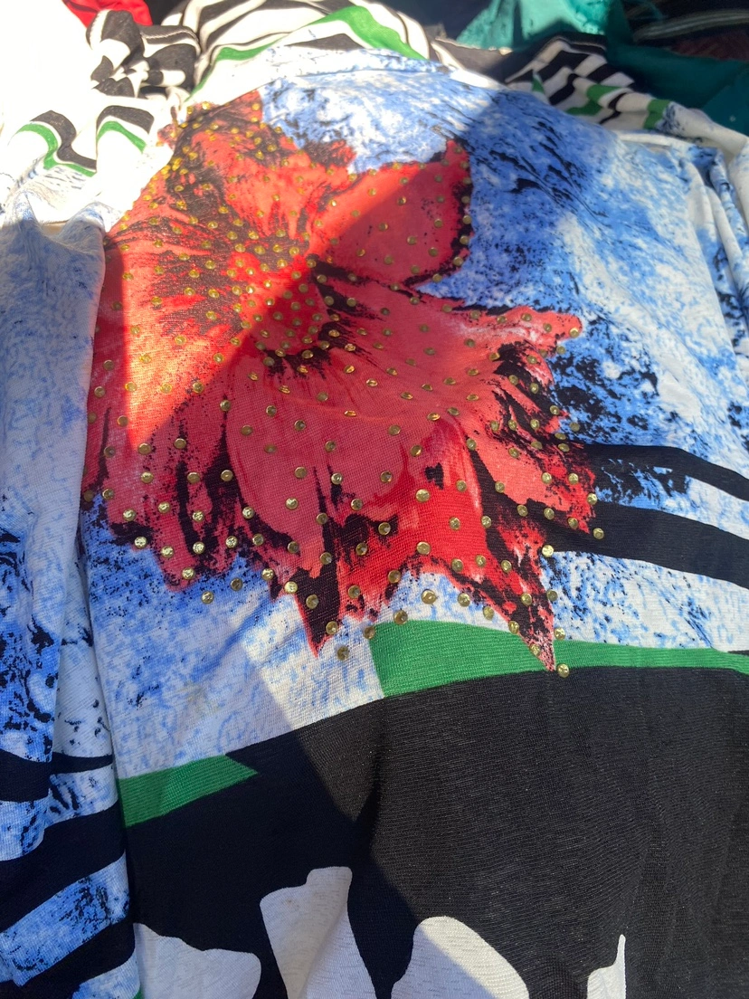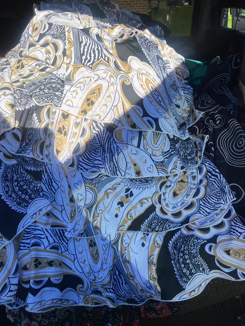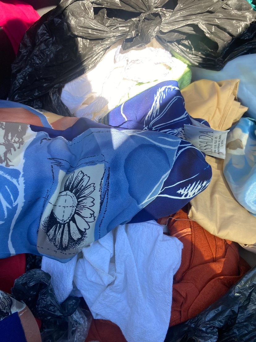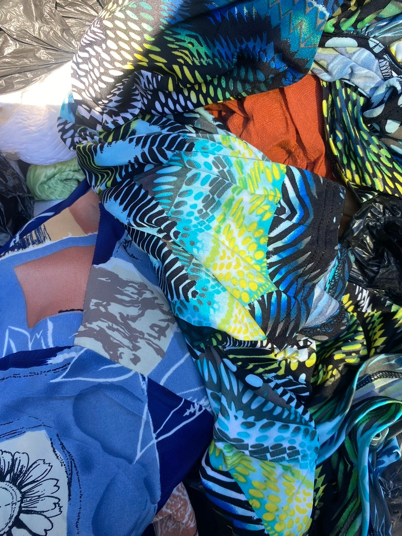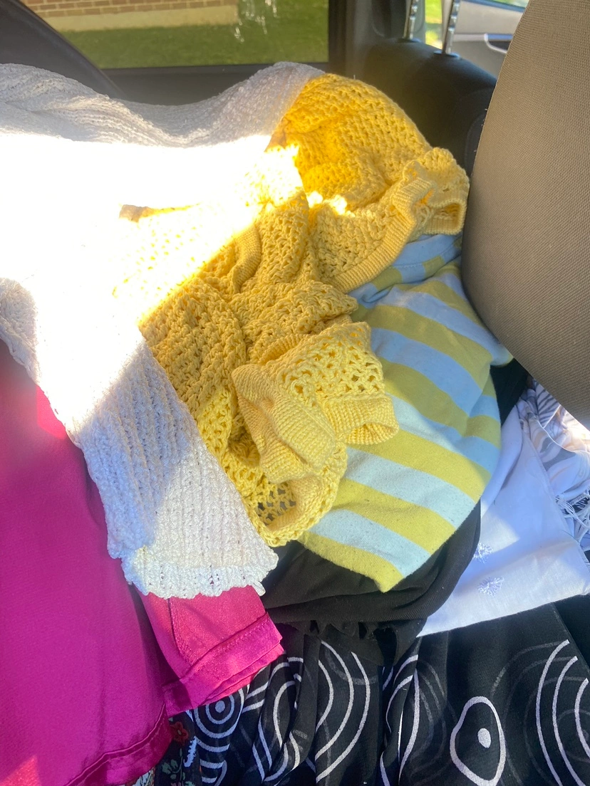 The bundle includes a variety of women's clothing items in different sizes and styles. There are tops, skirts, and dresses featured in various colours and patterns. The included clothing items feature a range of fabrics and embellishments.