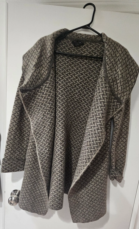 New Tahari ASL women's open-front cardigan . Features a grey and beige chevron pattern.
