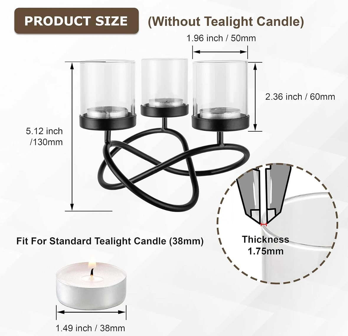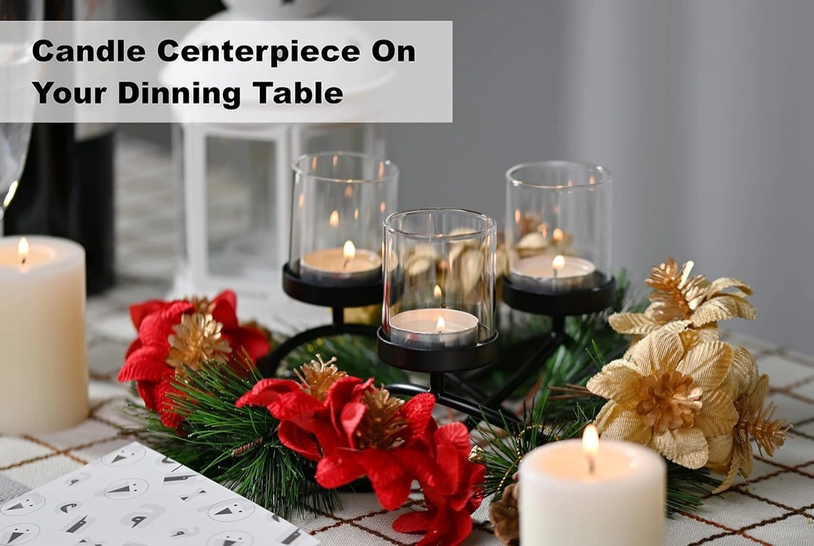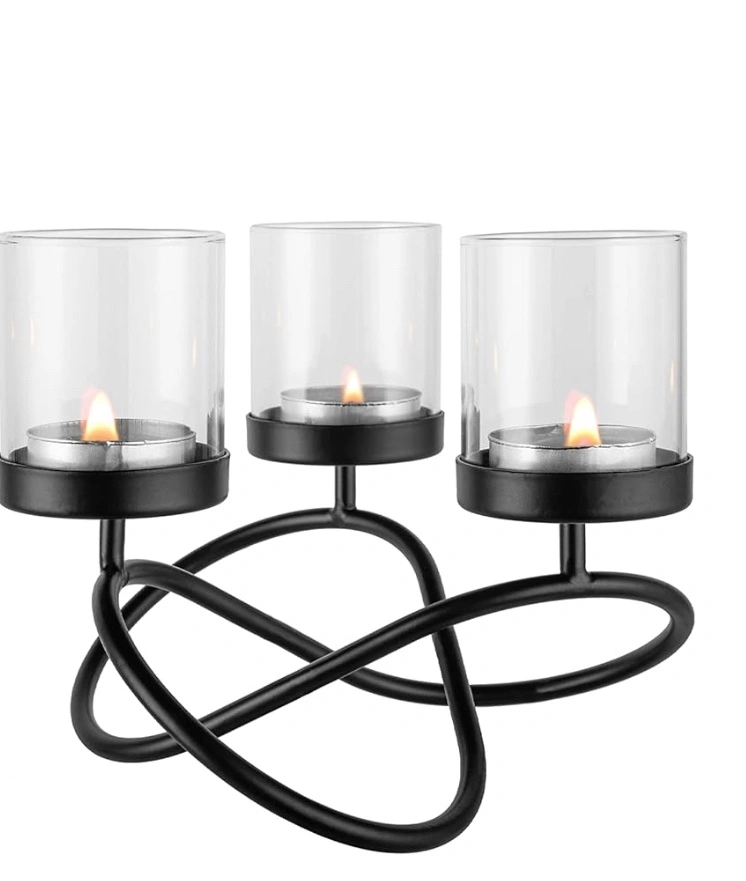 A pair of Black metal candle holder with three glass votive candle holders.