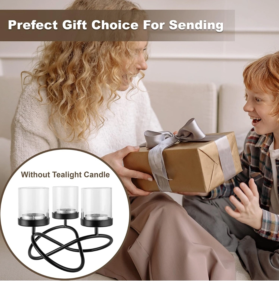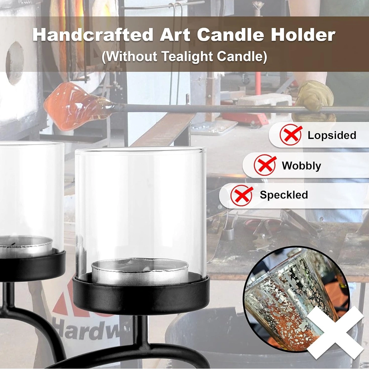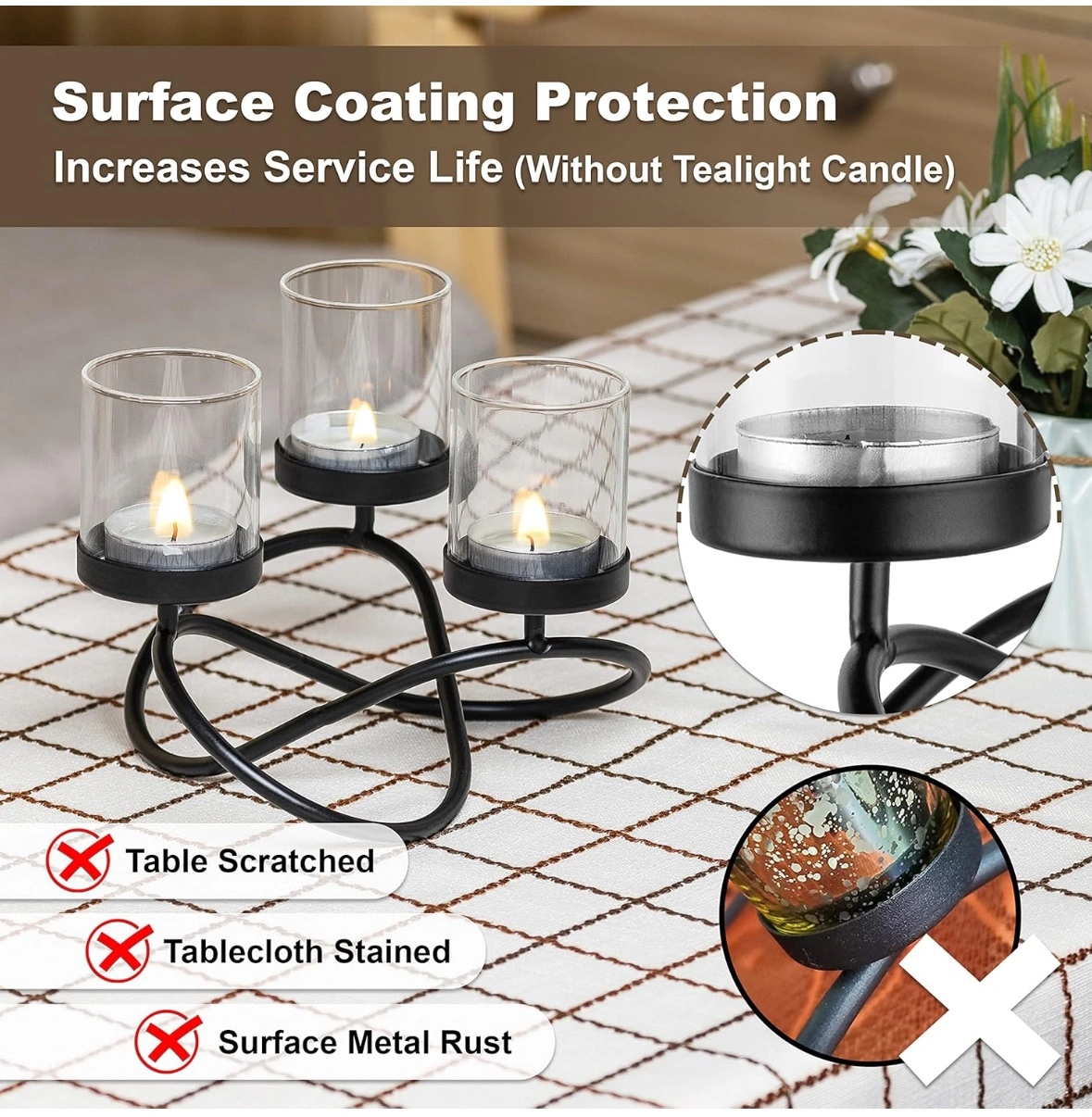 A pair of Black metal candle holder with three glass votive candle holders.