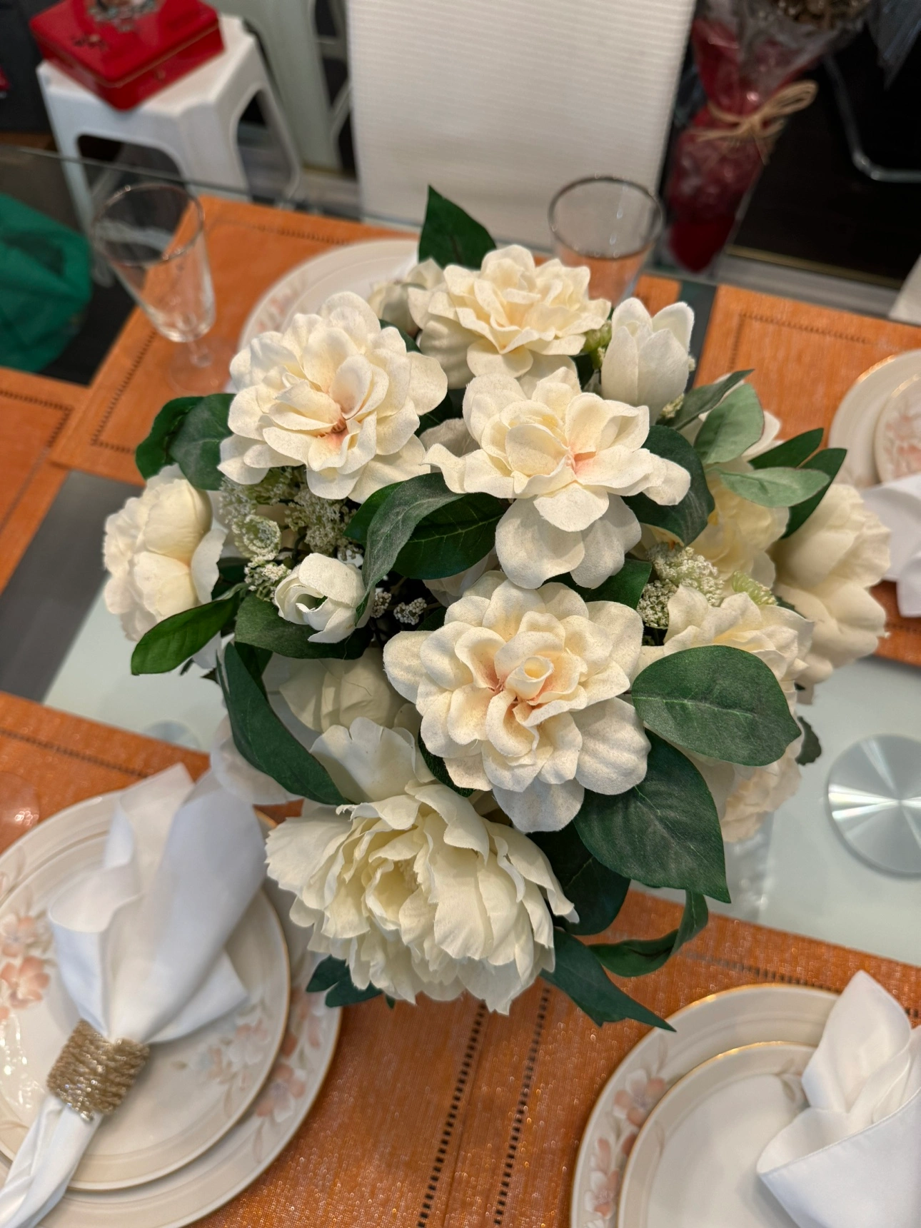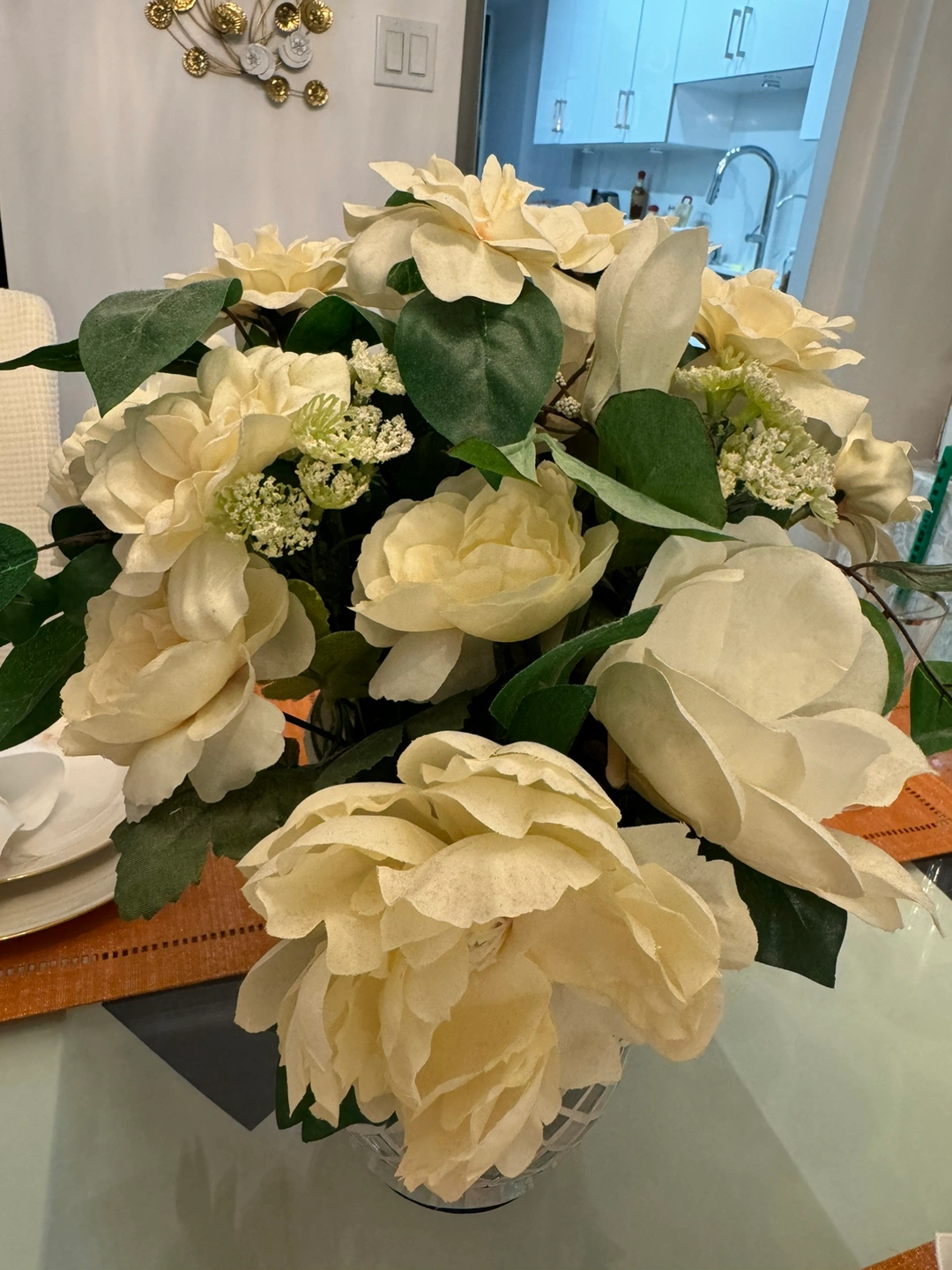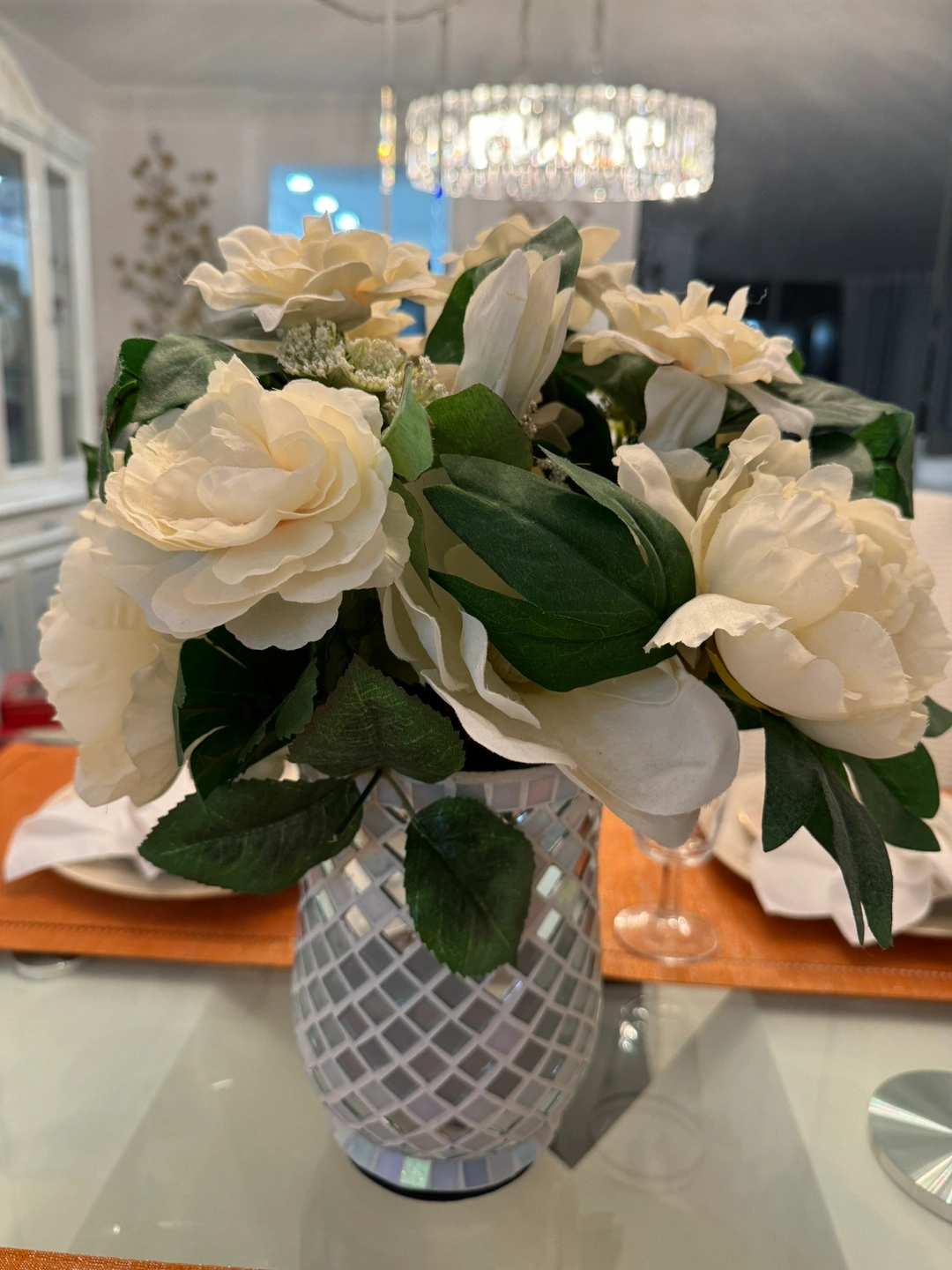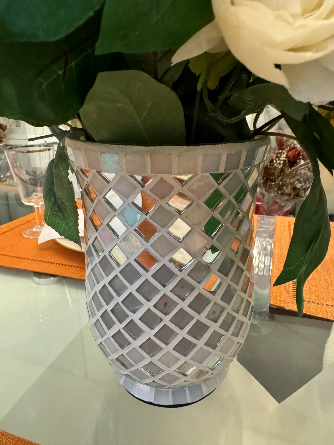 Beautiful Flowers in elegant silver , white and grey mosaic vase with a mirrored pattern . From pet free, smoke free home. Selling as there is no more space in our small locker. Pick up at Bathurst and Steeles , North York