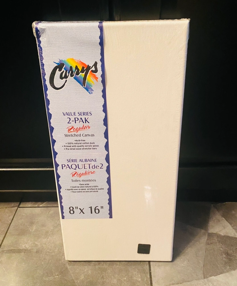 A pack of two 8x16" stretched canvases. They are acid free, 100% natural cotton duck, primed with quality acrylic gesso and have pre-dried wood stretcher bars. New, unopened package! #art #canvas #paint #supplies #bnip