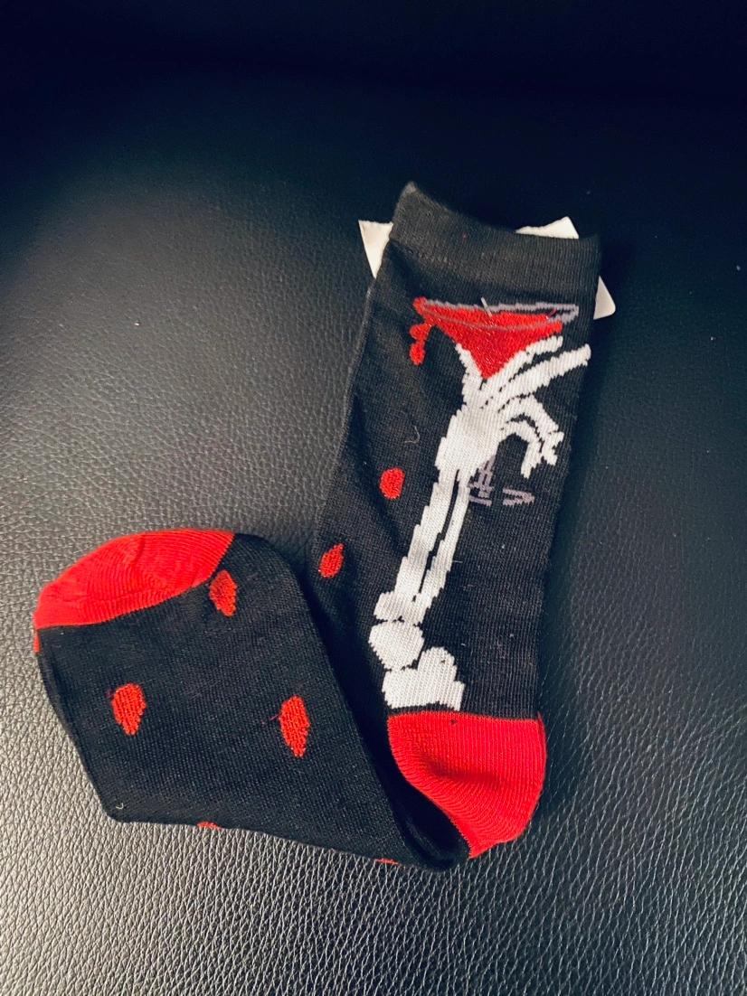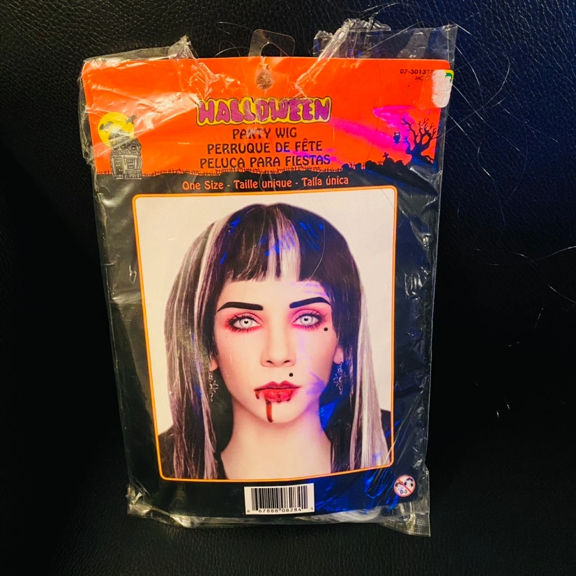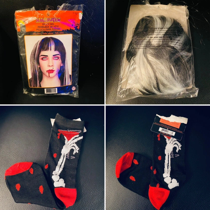 BNIP black & white adult wig, new in package. BNWT ladies size 6-9 skeleton blood martini socks with sparkly thread detail. Take both for $5! #Halloween #costume #accessories #spooky #unisex