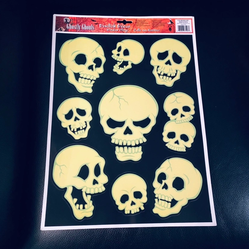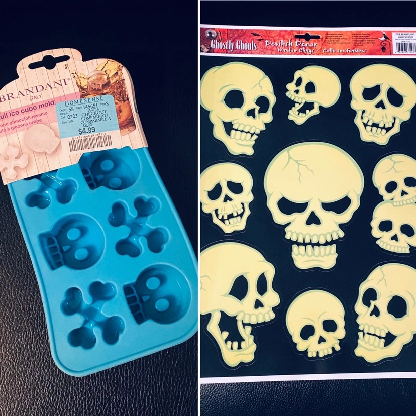 NEW - silicone skull ice cube mold and NEW - a set of large glow-in-the-dark skull window / mirror clings (reusable!) Take both for $5! #Halloween #party #accessories #spooky #decor