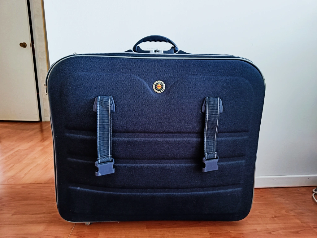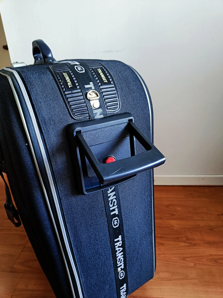 A black Transit luggage suitcase with a handle and wheels. approx. 80cm x 80cm x 30cm excellent condition. pick up only. check out my other listings for discounts!