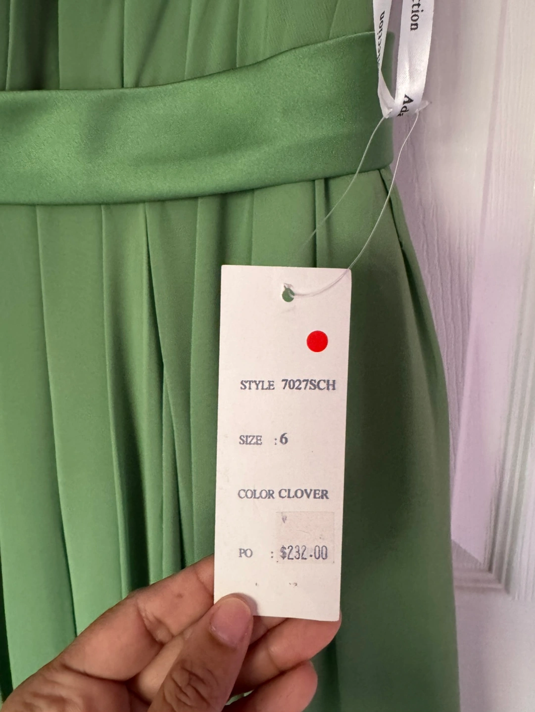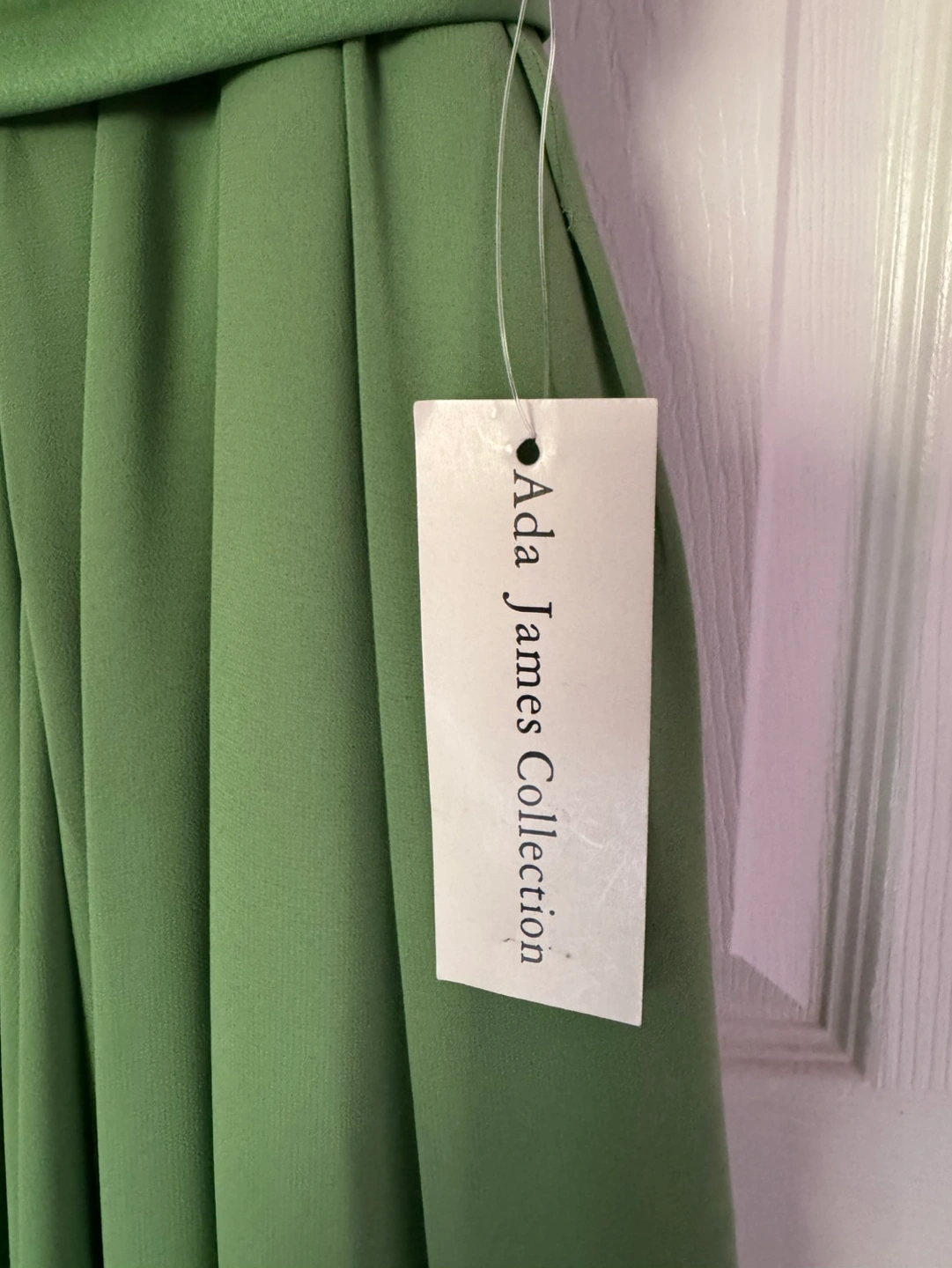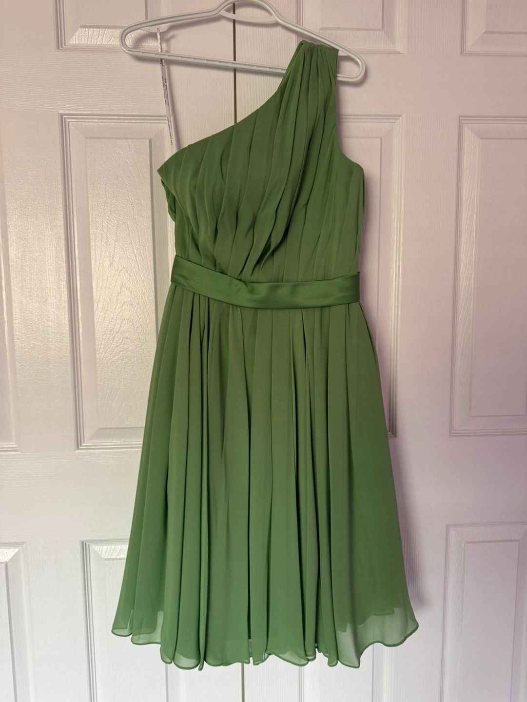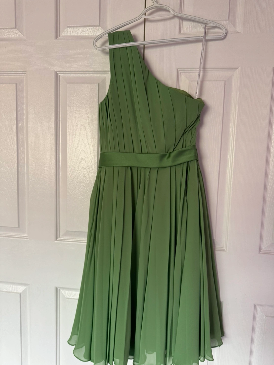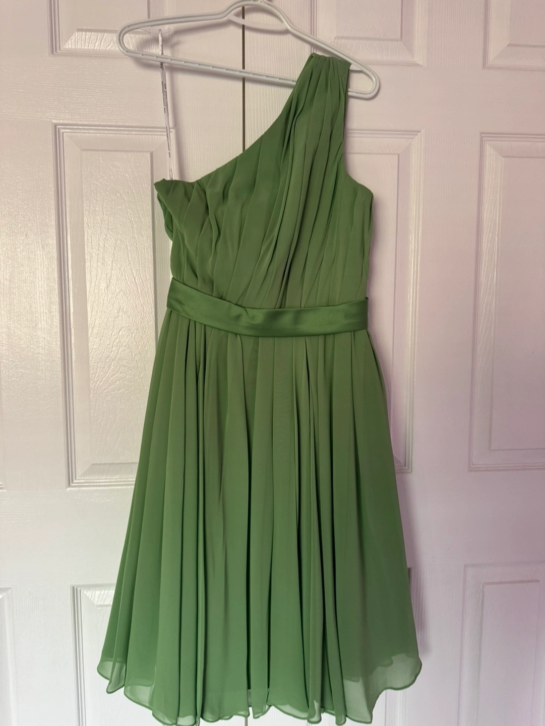 Green one shoulder dress with a satin waistband. The dress is in a light green colour and is made of a soft fabric. The dress is in great condition, with no flaws or damage. It is a perfect option for a wedding or special occasion. The dress has a simple but elegant design that would be suitable for a variety of events. Bought for $232 plus tax Selling for $120 Only serious inquiries
