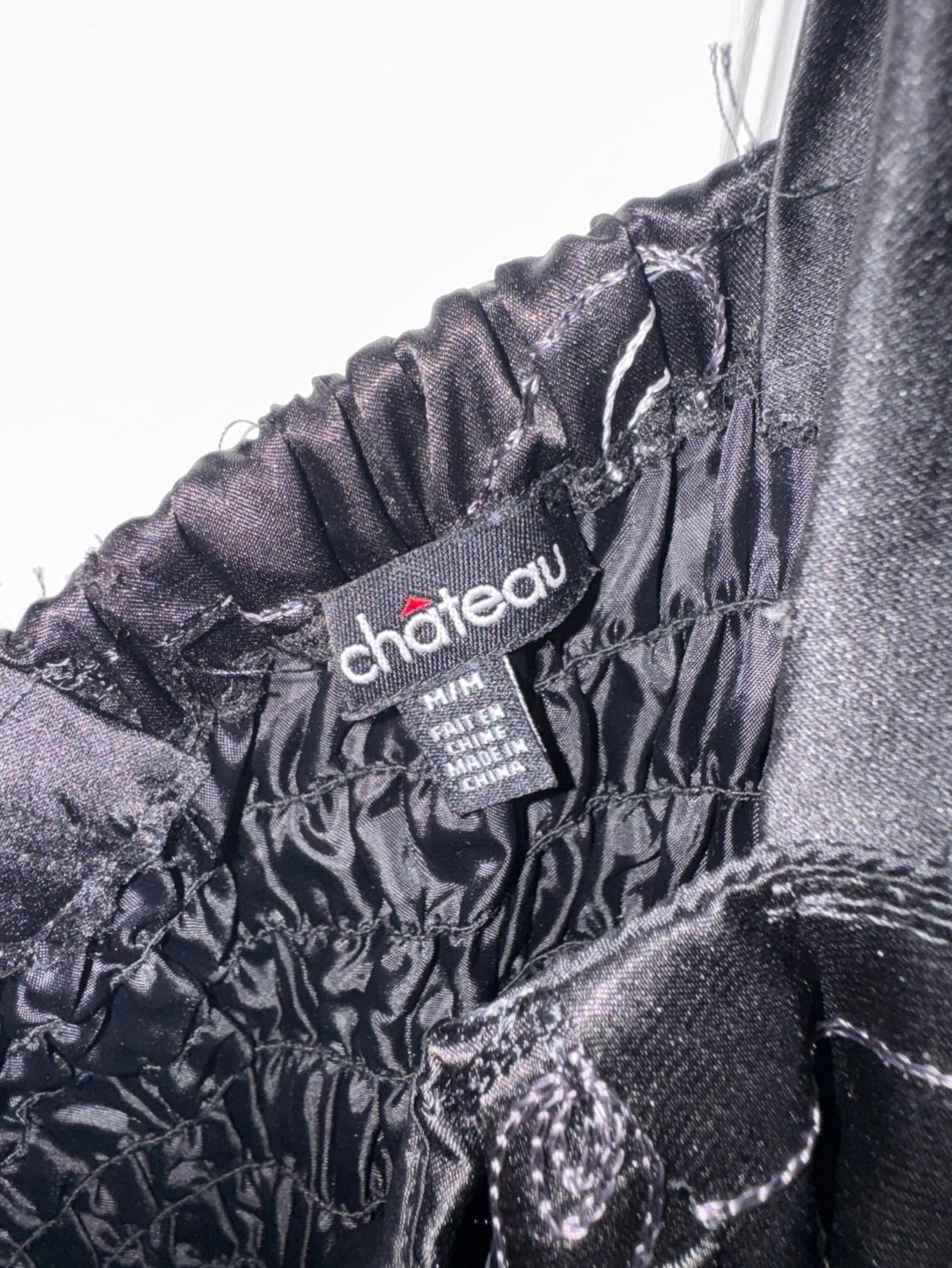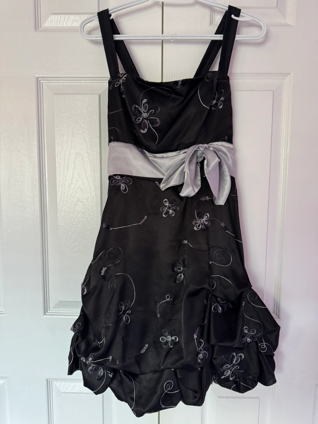 This is a beautiful black dress with a silver satin ribbon and silver embroidery. It is a sleeveless, strapless dress with a fitted bodice and a flowy skirt. It would be perfect for a special occasion.