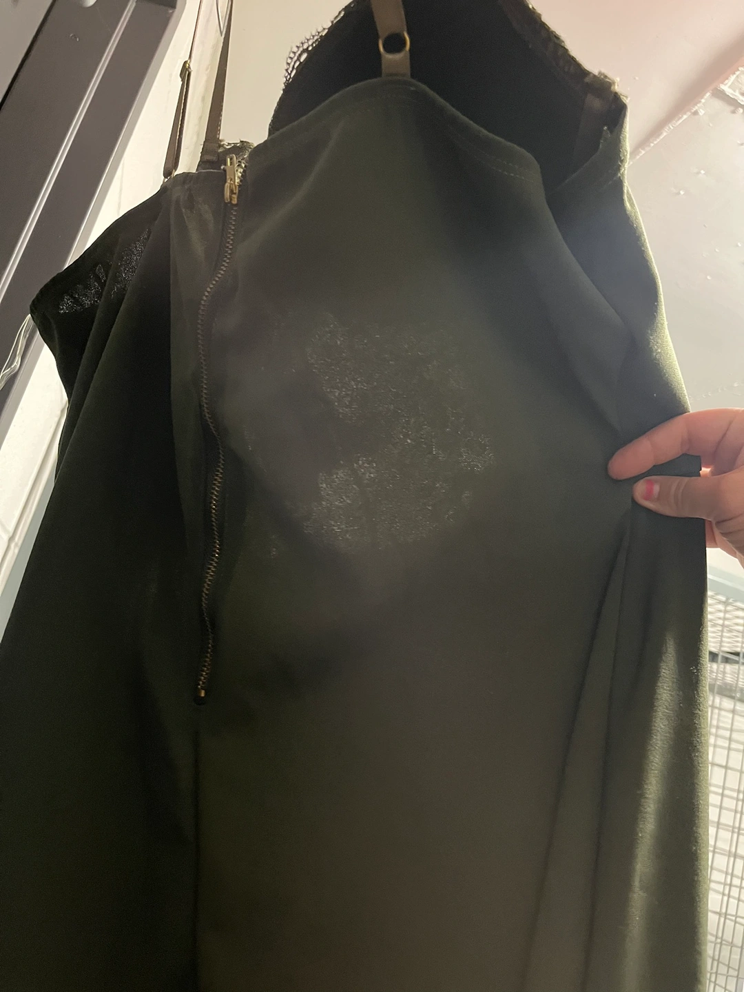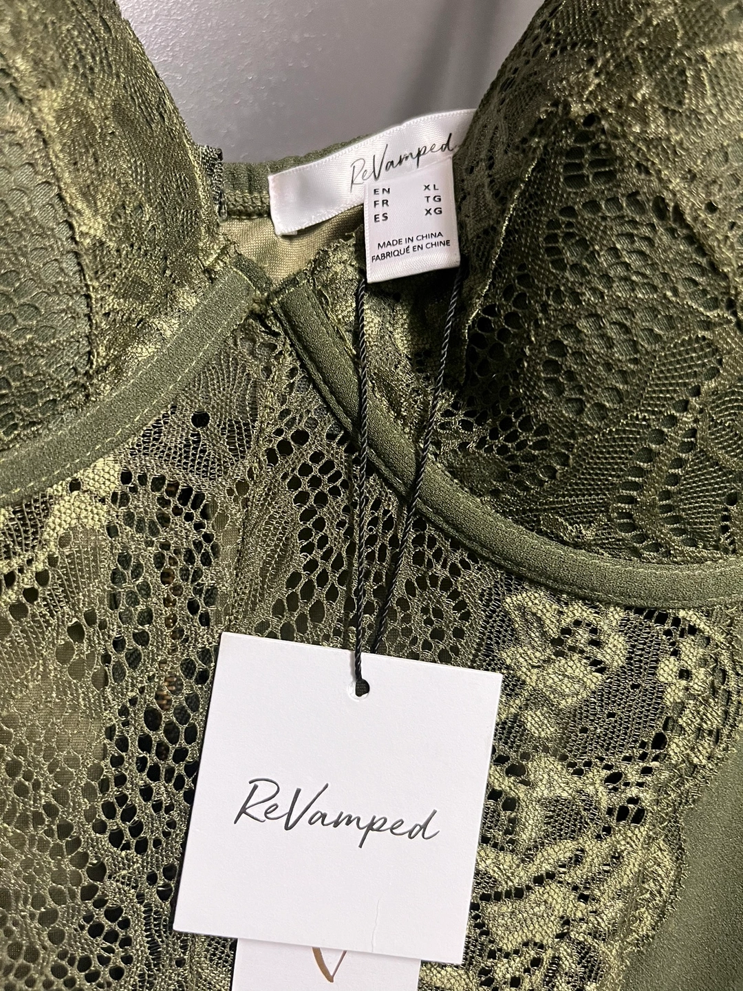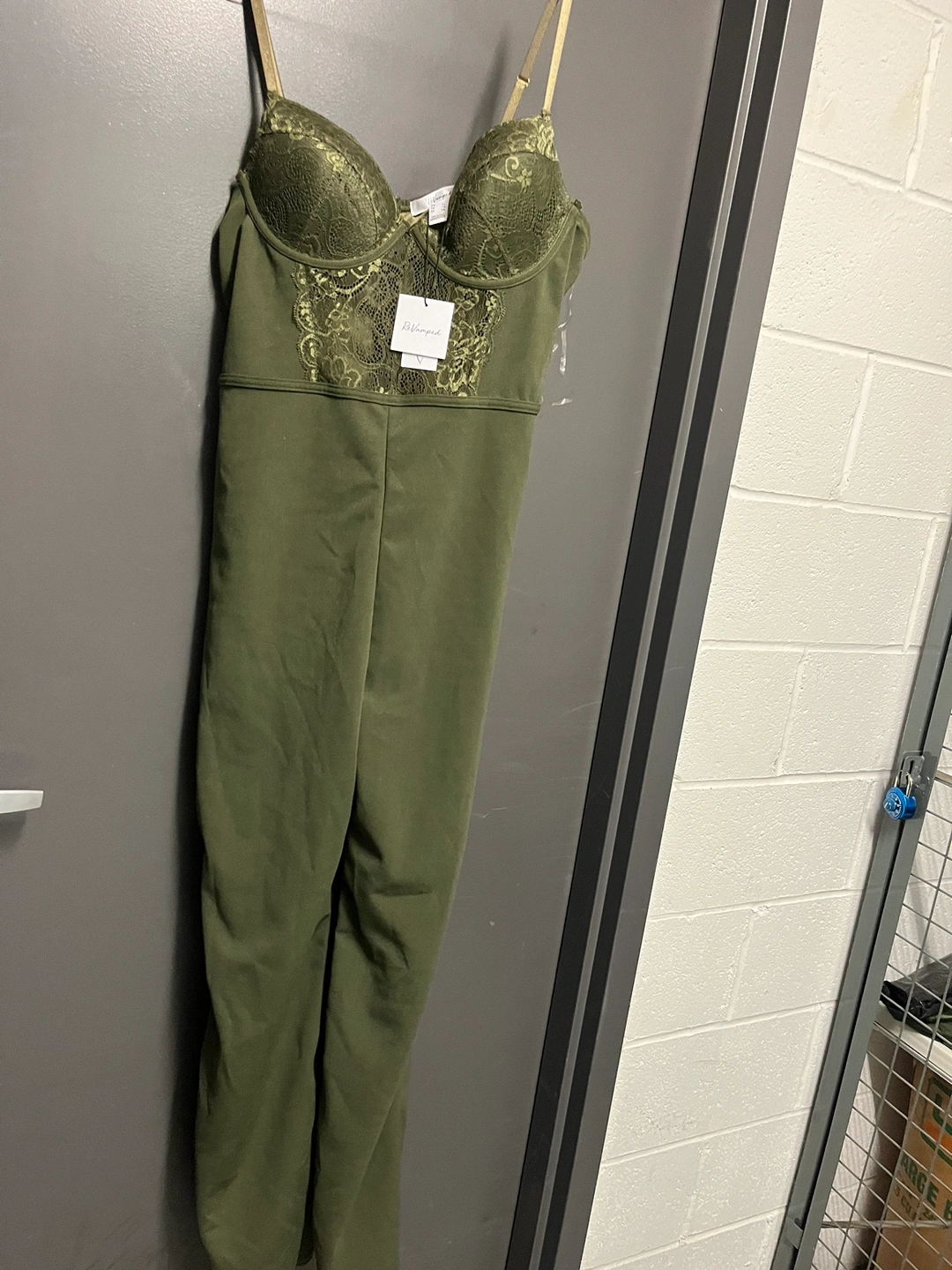 Green lace jumpsuit with a fitted silhouette. Features a zipper closure in the back. Size XL. Made in China.