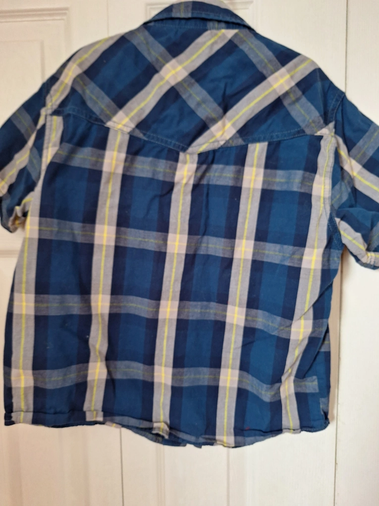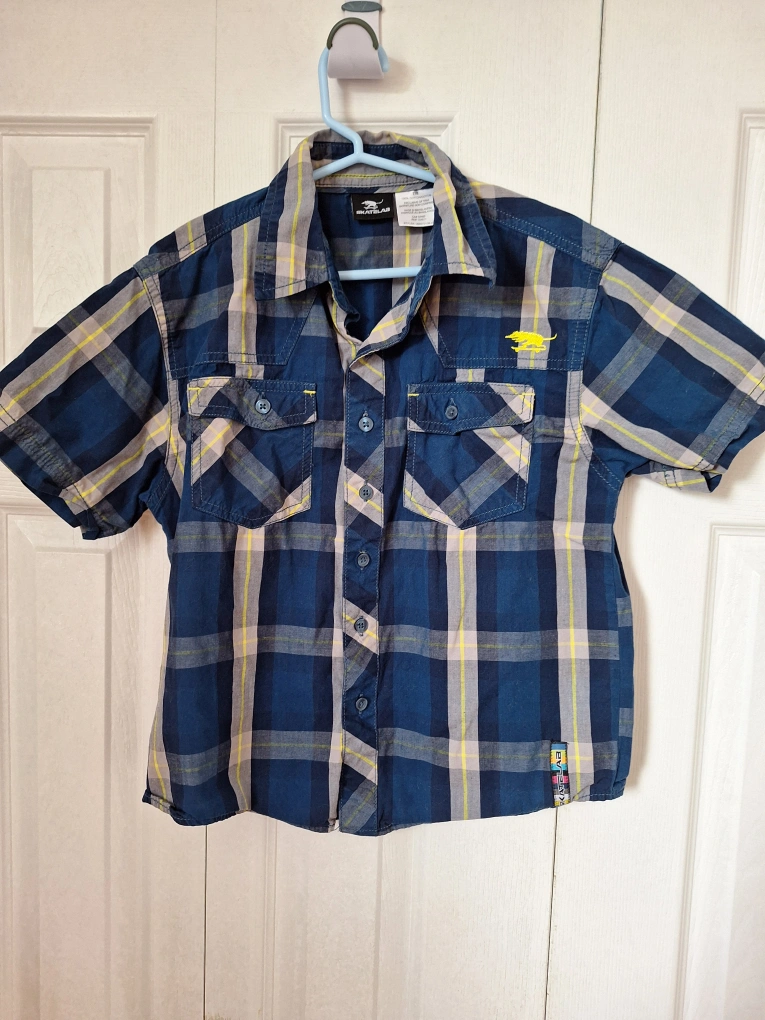 Blue and yellow plaid button up shirt with two front pockets. It is a short sleeve shirt. This is a great shirt for any occasion. Barely worn. * Check out my other ads for great deals on clothing and more*