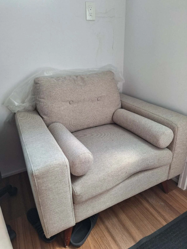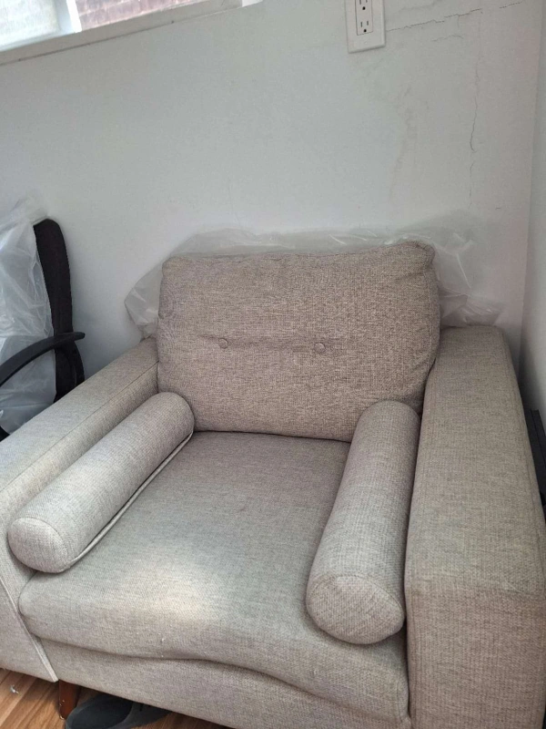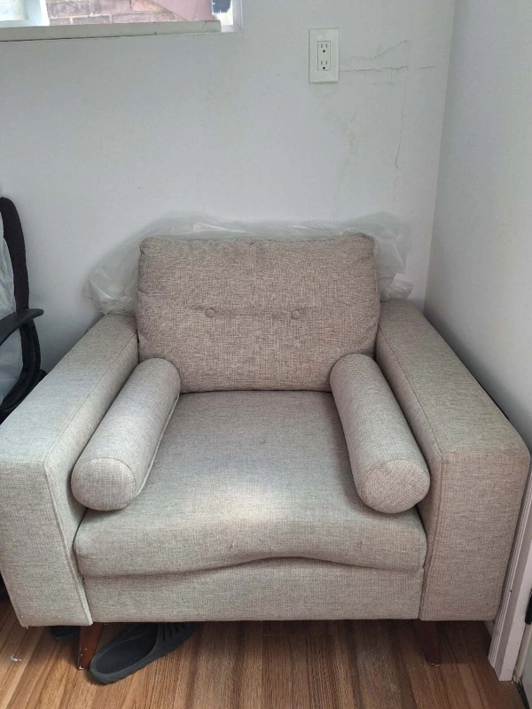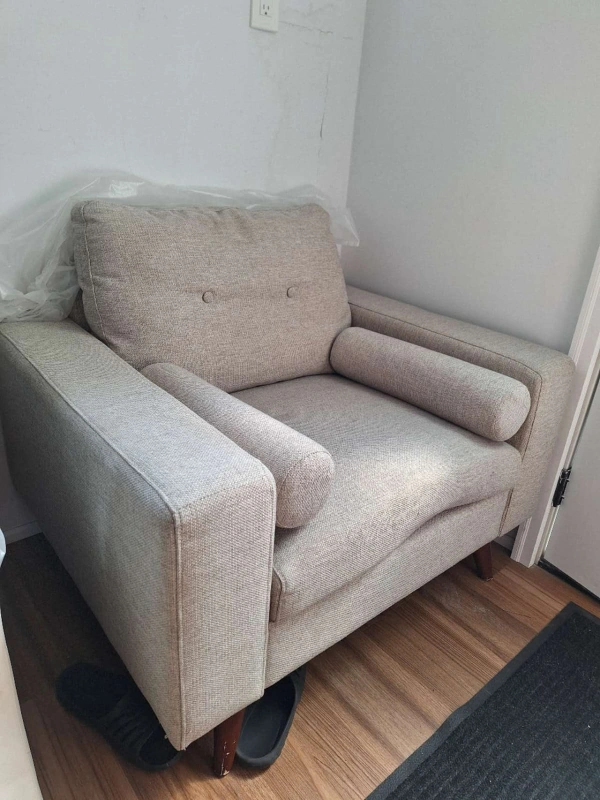 A grey armchair with two pillows, one on the back and one on the armrest. It has wooden legs. Westelm Chair in Frost Grey, Chenille Tweed. Small stain on the seat but should be able to clean it easily. Will need a relatively big car to carry. It is pretty heavy so please bring help. Retails for $1,300. Dimensions: Length: 39inch Width: 32inch Total Height: 27.5inch Will not respond to "is this available" Pickup Harbord and Bathurst https://www.westelm.ca/products/dennes-chair-h6764/