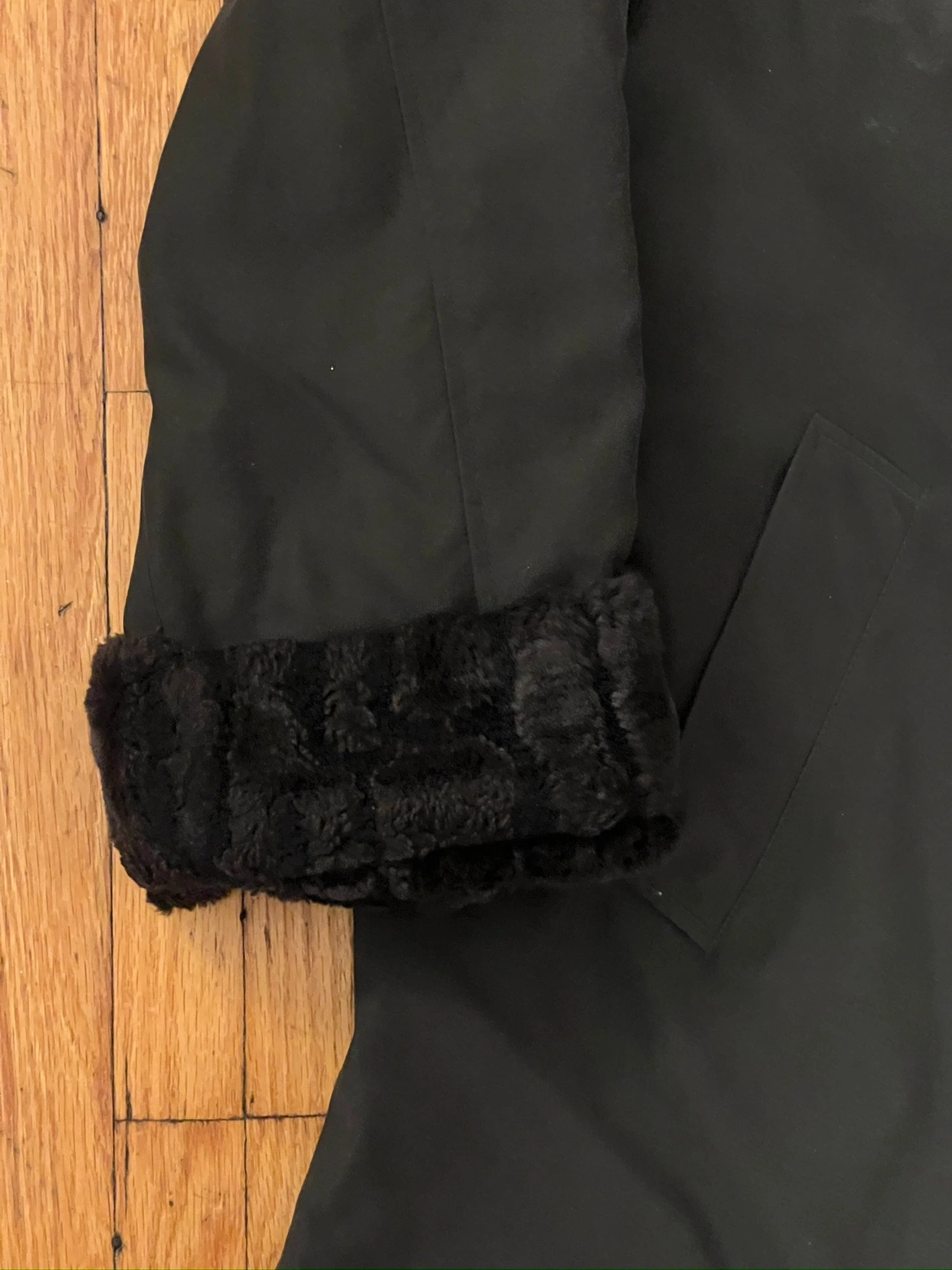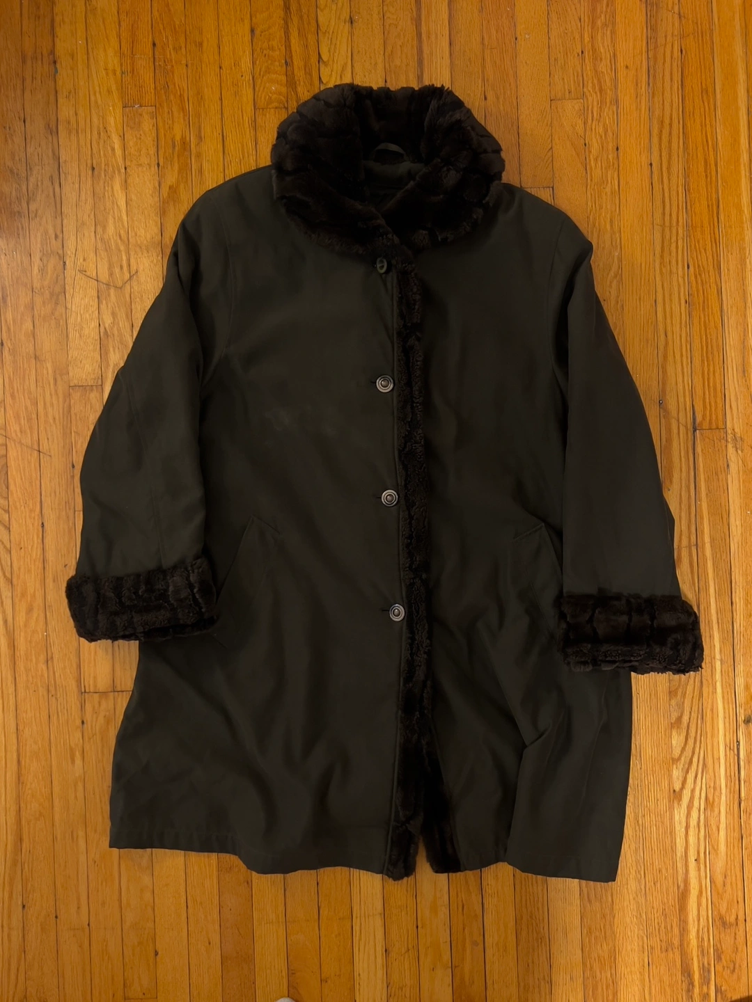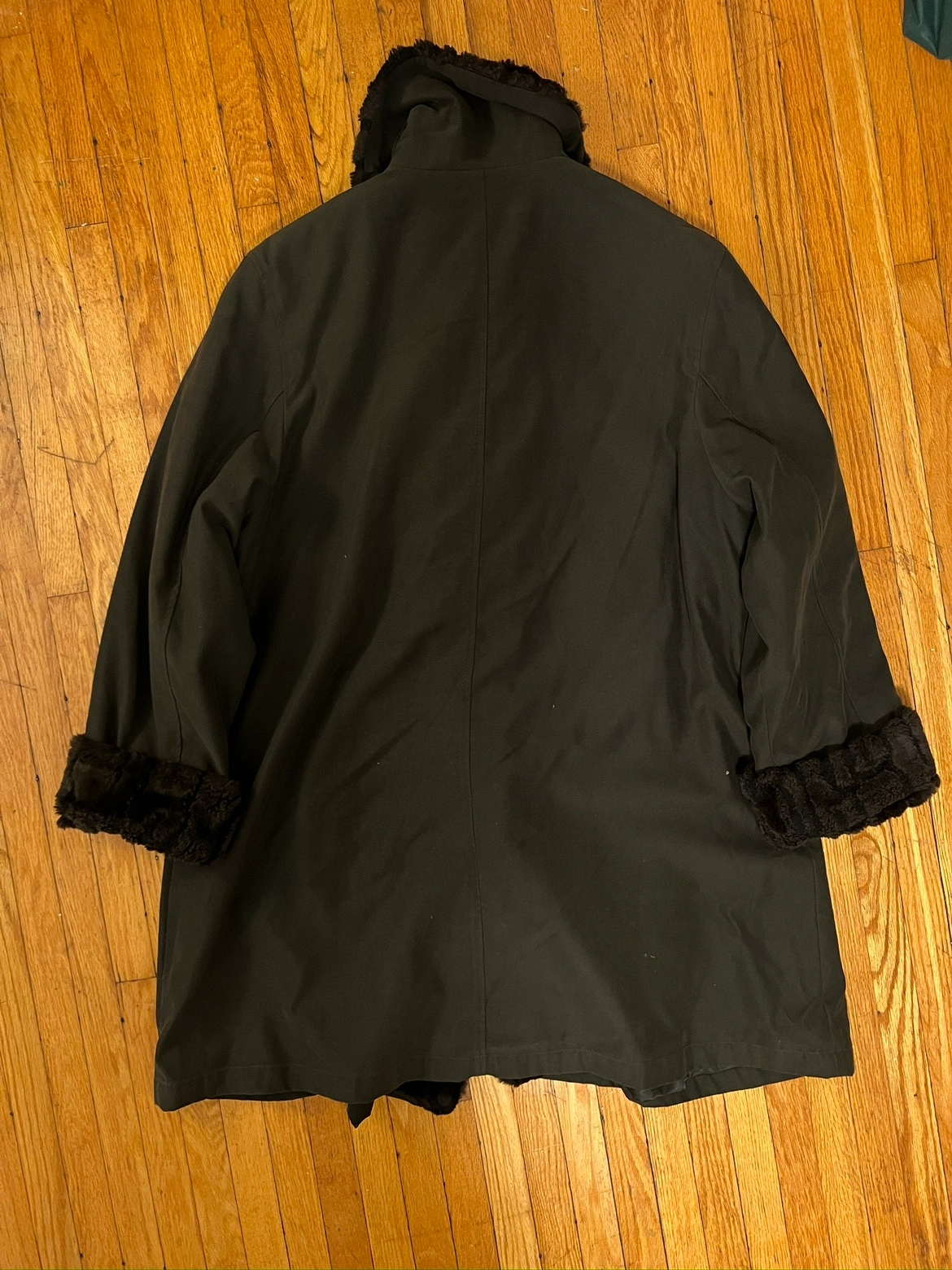 This is a green coat with a faux fur trim collar and cuffs. The coat has a button front closure. It is a great winter coat for a colder climate. Coat length 28” Sleeve 18” Pit to pit 19”