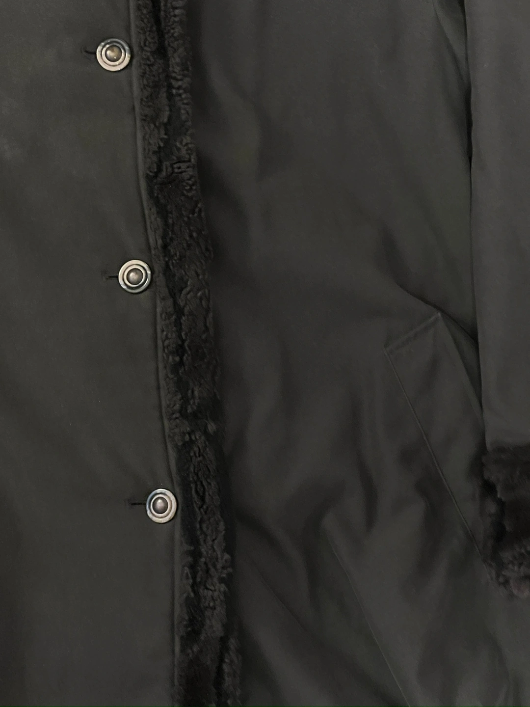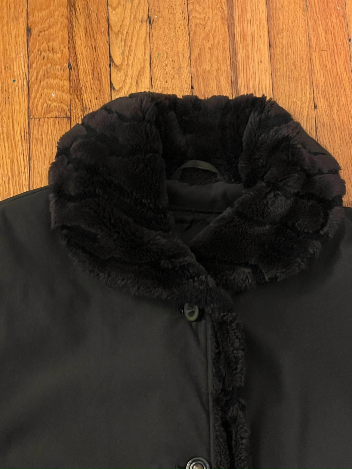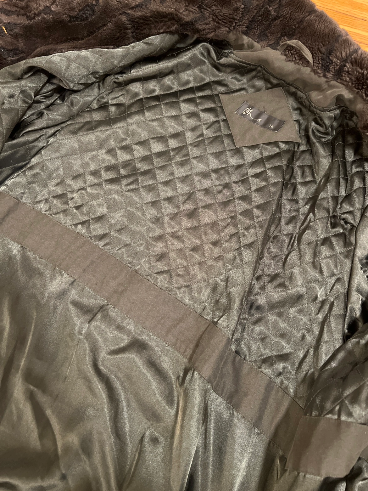 This is a green coat with a faux fur trim collar and cuffs. The coat has a button front closure. It is a great winter coat for a colder climate. Coat length 28” Sleeve 18” Pit to pit 19”