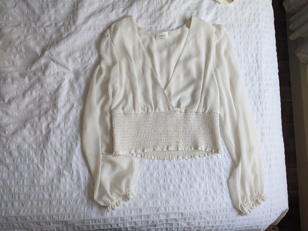 Wilfred brand from Aritzia WISTFUL blouse with low neck, puff sheer sleeve. cream cour. super pretty and in great condition size medium pickup downtown near OCAD on McCaul st tags shirt top Wilfred Aritzia ladies women tee. girls white cream formal semi cute date moving sale bundle party event holiday