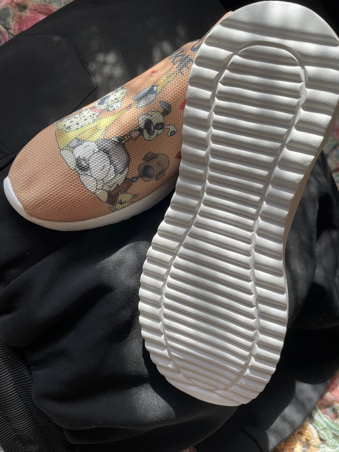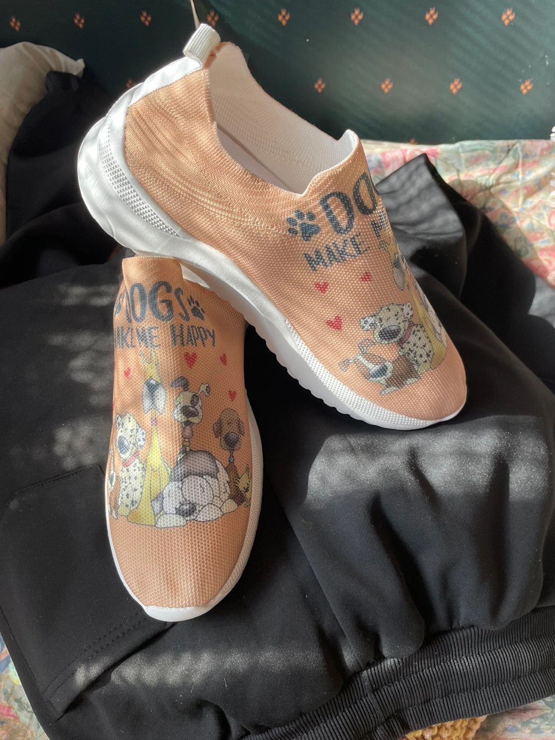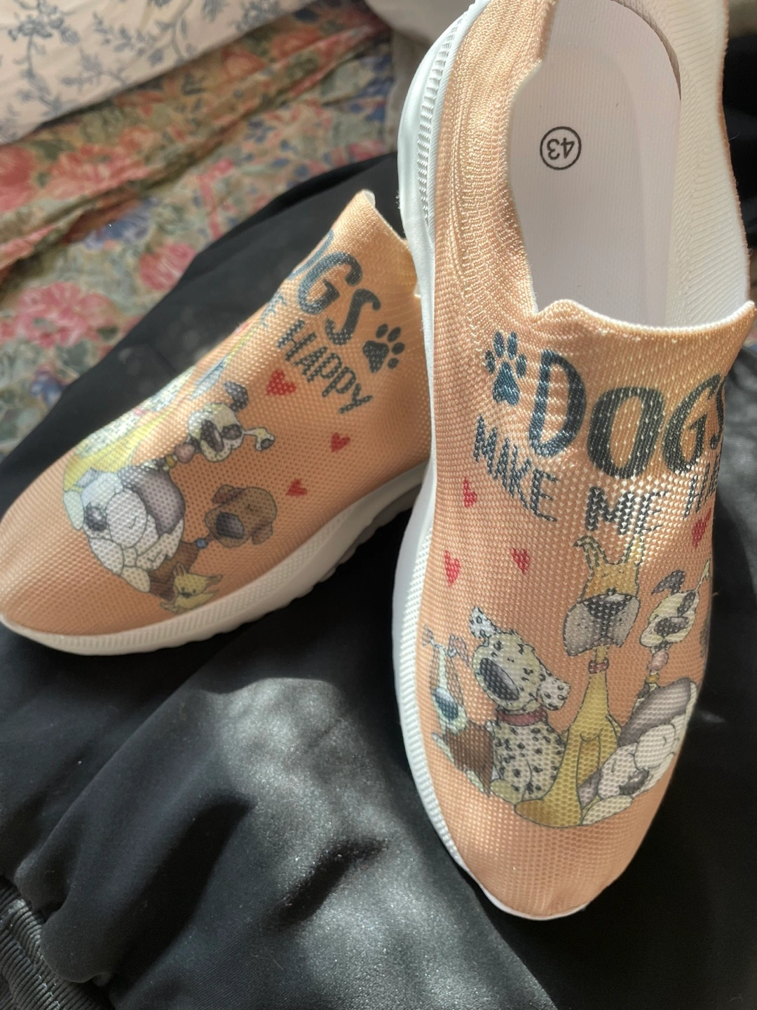 Slip on canvas sneakers with dog print design. Slight platform sole good support for walking not flimsy.