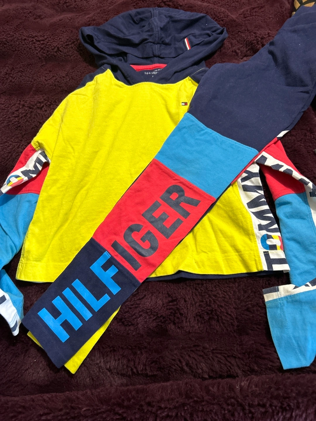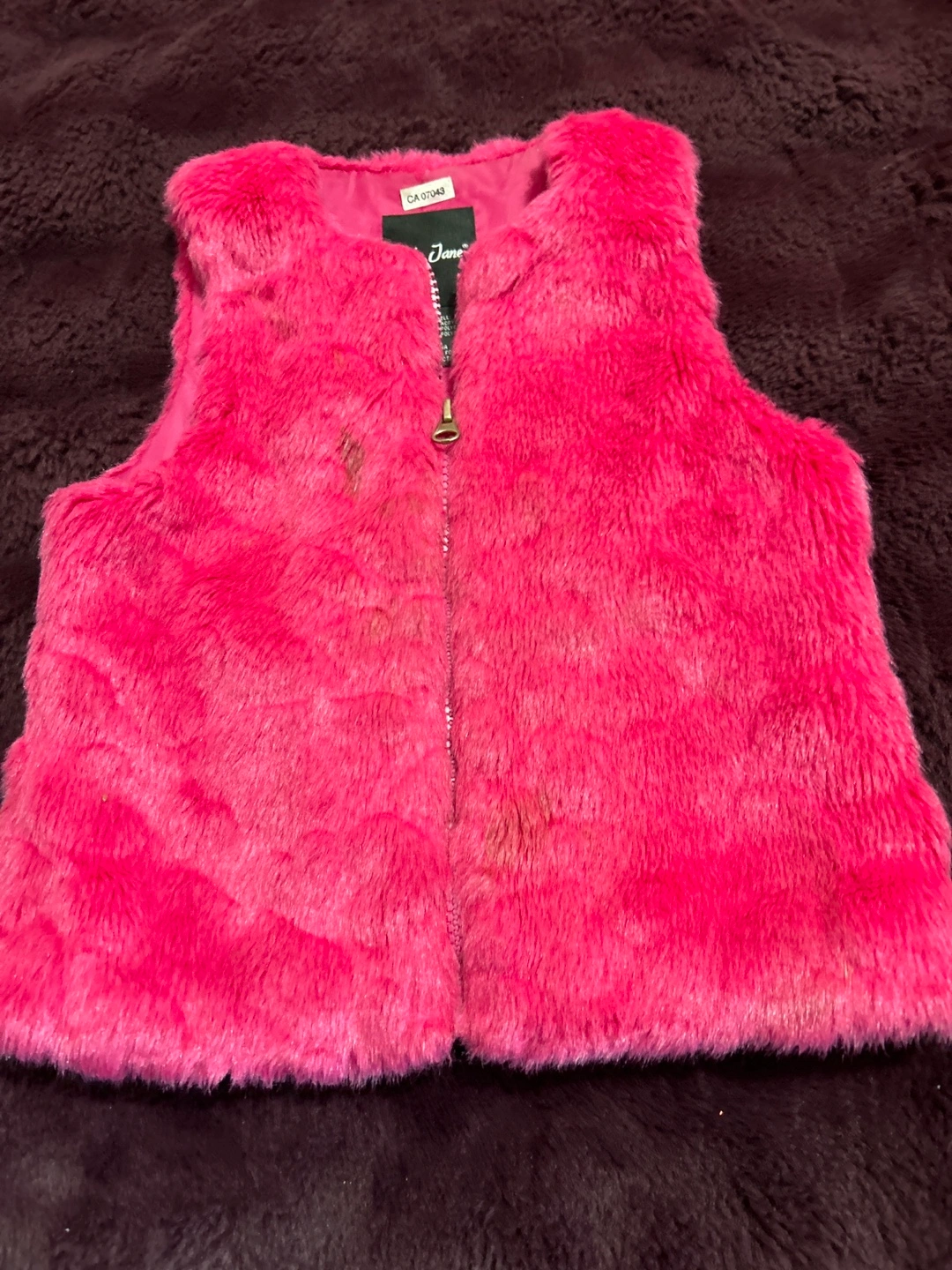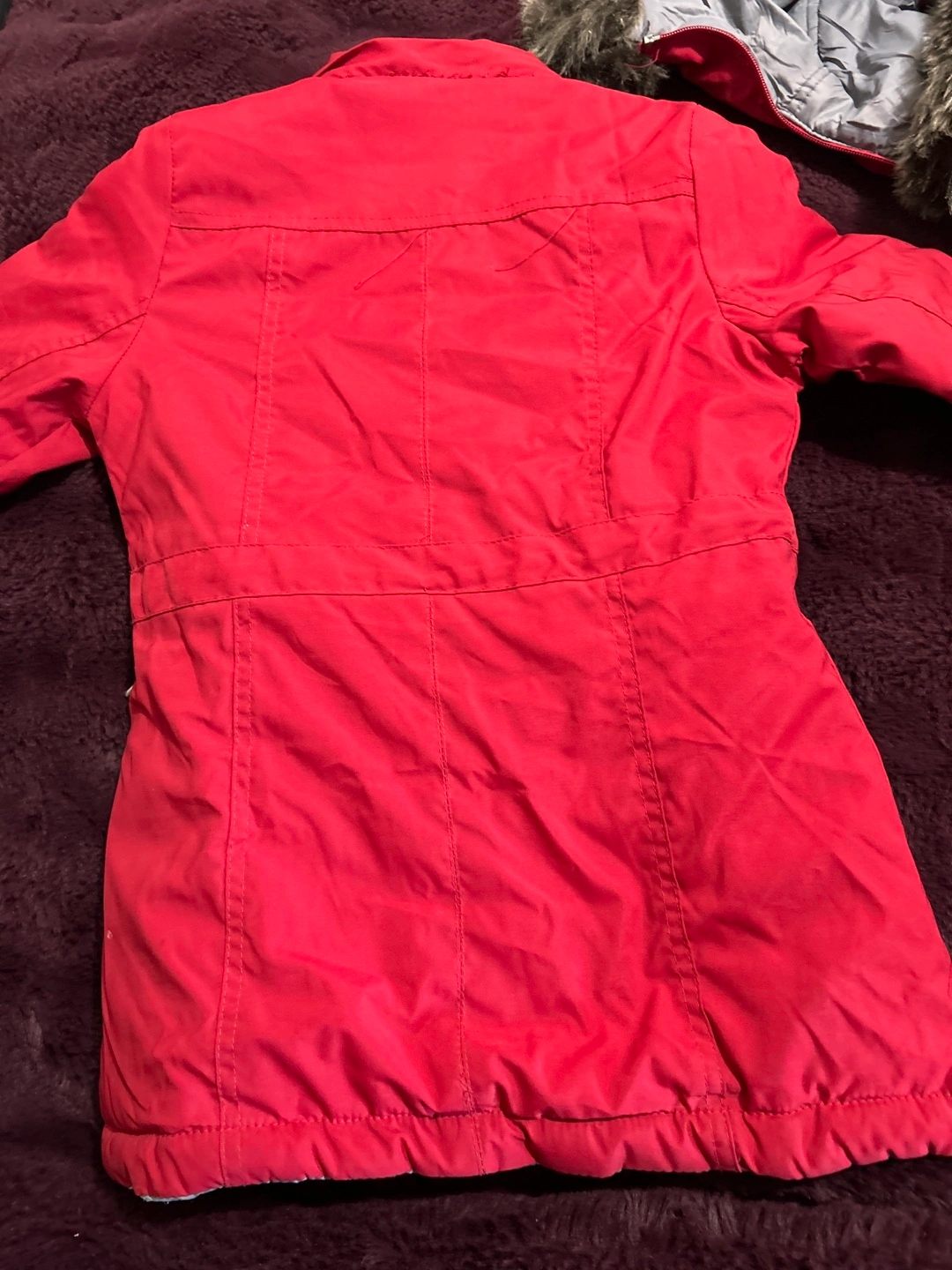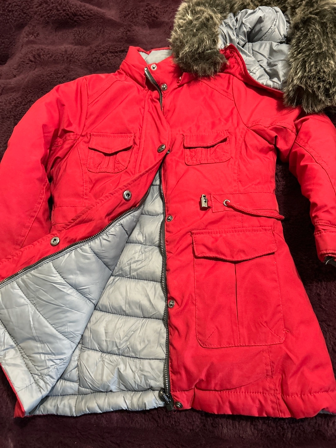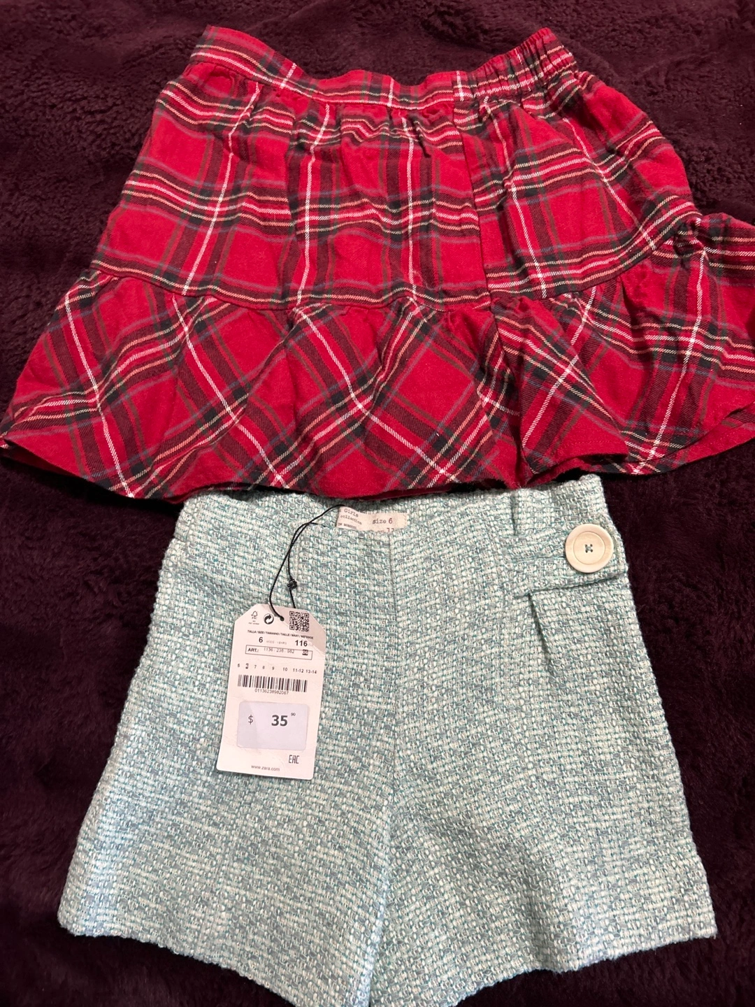 Red winter jacket with fur-lined hood. Pink faux fur vest. Tommy Hilfiger long sleeve shirt and leggings set. Plaid skirt nice for Christmas Size 8 Cute mint, Jacquard shorts Zara