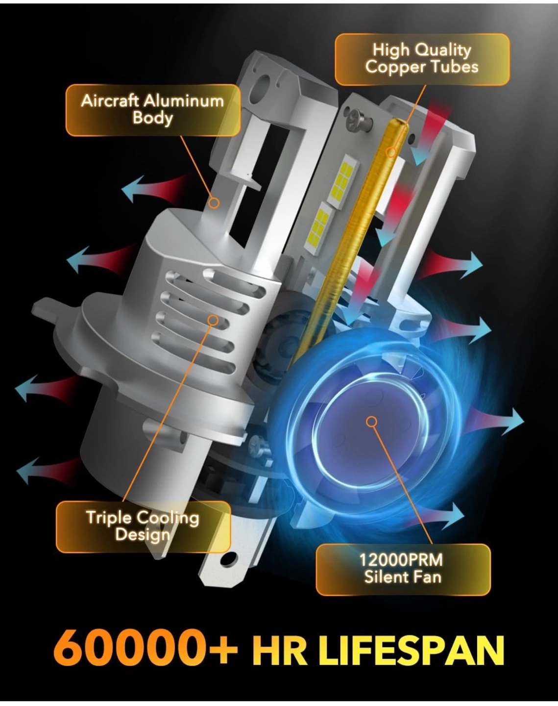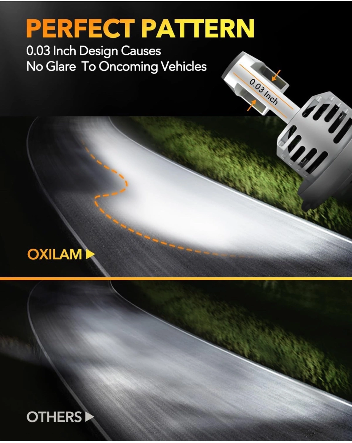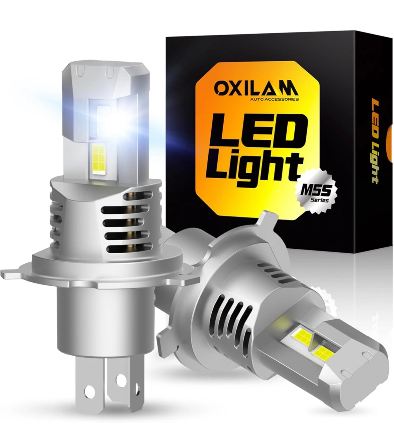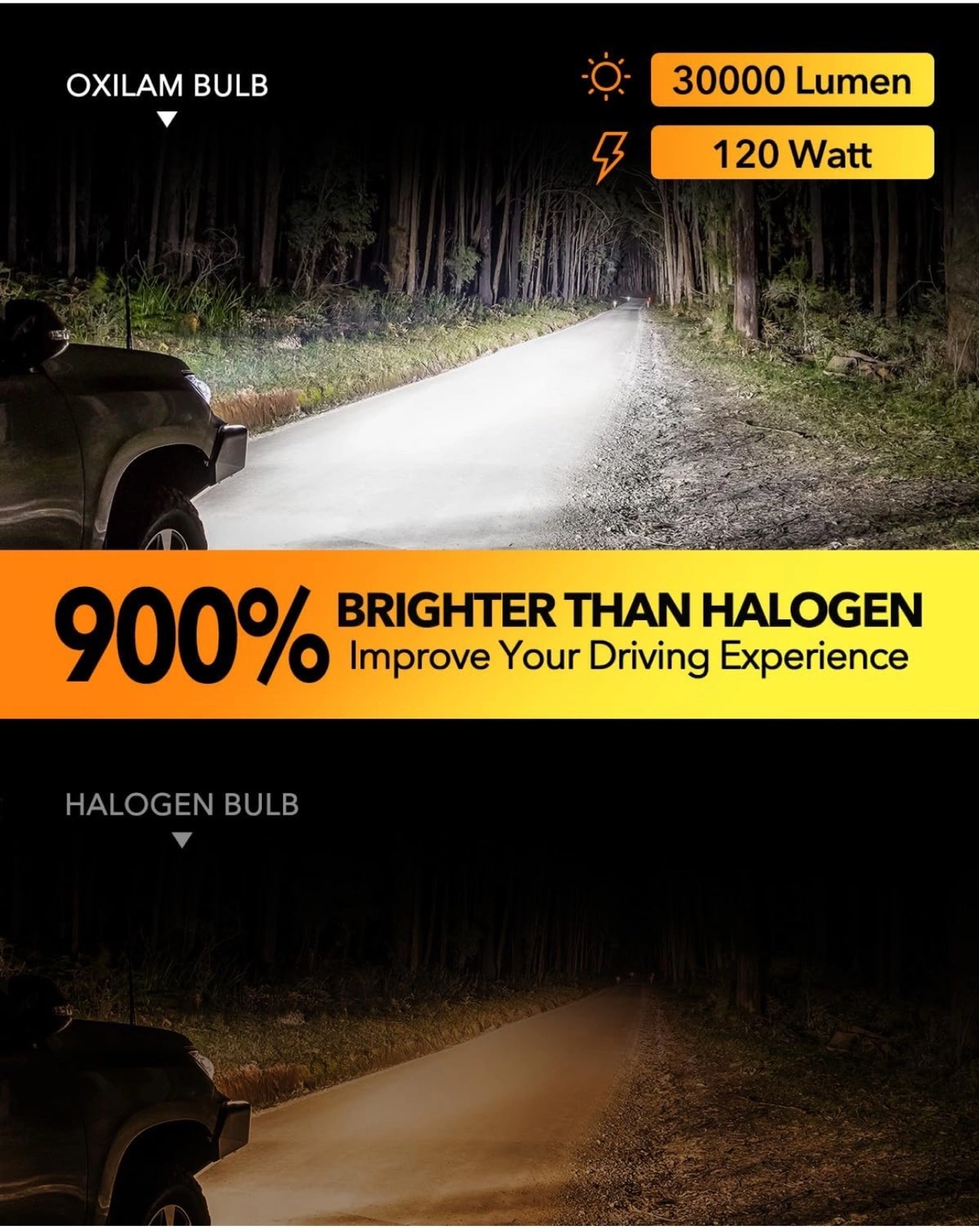 LED Headlight Bulbs. High brightness, long lifespan, fast heat dissipation and off-road capabilities. Upgraded OXILAM H4 9003 HB2 LED Headlight Bulbs, 30000LM 800% Brighter 6500K Xenon White, HB2 light bulb Canbus Error Free Cooling Fan Plug and Play for Car Motorcycle, Pack of 2 Fit type Universal Fit 【800% Brighter than Halogens】 H4 LED headlight bulb adopts 12pcs high power chips, 6500K xenon white, up to 120W, 30,000 lumens per set, 900% brighter than stock 9003 halogen bulbs, you can see animals or other obstacles on the road ahead of time, effectively improve visibility at night and make driving safer. 【1 : 1 Perfect Beam Pattern】Compared to those 0.05 inch bulbs on the market, the H4 9003 LED headlight bulb adopt an ultra-thin 0.03 inch base board to more accurately mimic the halogen bulbs. The light is focused down the road and the clear cutoff point does not cause glare to oncoming vehicles and drivers. 【5 Minutes Quick Installation】 HB2 led headlight bulb feature an all-in-one compact design with no bulky external drivers and no additional wiring harnesses. The plug-and-play built-in driver saves space and allows the 9003 bulb to be installed into the bulb housing in less than 5 minutes, even when space is limited, easily solving common installation problems such as dust protection. 【Over 10 Years Lifespan】9003 led bulbs are made with enhanced aluminum material, dual copper base board and 12,000RPM high speed silent cooling fan that helps dissipate the heat generated by the LED chips quickly, effectively extending their life to over 10 Years and saying goodbye to frequent replacements. 【99% Canbus Ready】Built-in latest smart IC driver makes 9003 LED with 99% of the vehicle computer system without error or flicker.