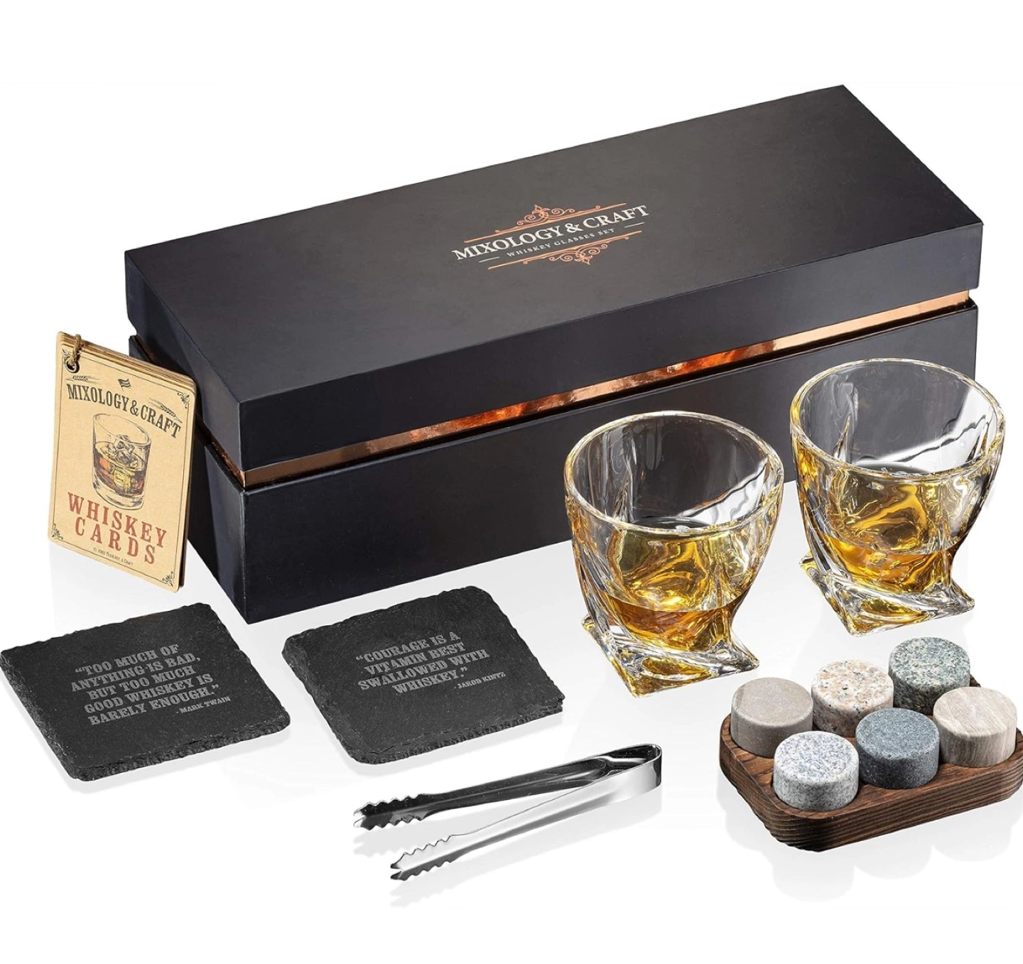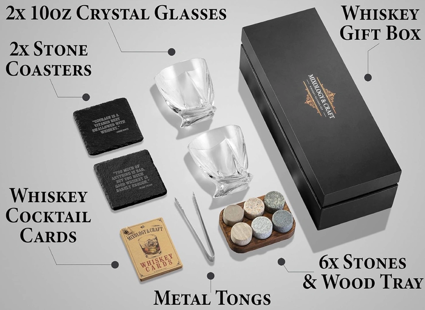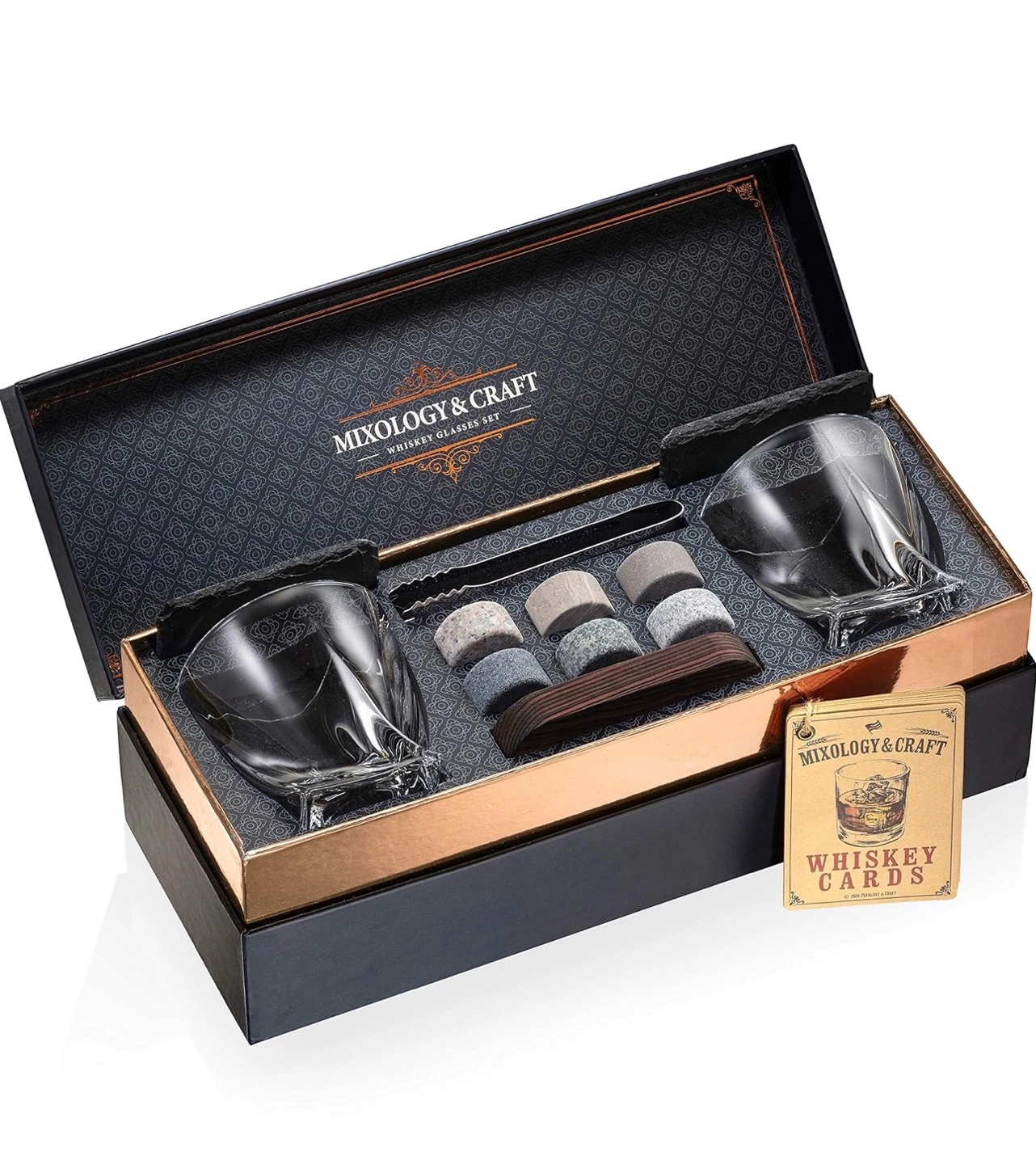 Whiskey glasses, stones, and recipe cards in a gift box. Includes tongs. Whiskey Stones Gift Set for Men | Whiskey Glass and Stones Set with a Classy Gift Box, 6 Granite Round Whiskey Stones and 10oz Whiskey Glasses | Whiskey Lovers Gifts for Men, Dad, Husband, Boyfriend • All-in-one whiskey gift set for strong whiskey fans – perfect for gifting on any occasion • Includes 2 stylish rocks glasses (10oz/300ml) + 6 round 100% natural granite whiskey stones • Features an elegant wood whiskey stone storage tray + metal tongs + 2 slate coasters + whiskey cocktail cards • Keep your drink chilled without melting ice that waters it down – these whiskey stones won’t scratch your glasses • Upgrade your man cave with this attractive and durable whiskey gift set – built to last The Mixology & Craft Whiskey Stones Gift Set is everything a whiskey lover could want and more! With 2 stylish rocks glasses (10oz/300ml), 6 round 100% natural granite whiskey stones, an elegant wood whiskey stone storage tray, metal tongs, 2 slate coasters, and whiskey cocktail cards, this premium-crafted whiskey set is perfect for gifting on any occasion. Keep your drink chilled without melting ice that waters it down with these whiskey stones that won't scratch your glasses. This attractive and durable whiskey gift set is designed to last, and the customer service team is available to assist you 24/7. Upgrade your man cave with this pro-level quality set! This is the perfect whiskey stones gift set for men, whiskey lovers, dad, husband, boyfriend, friends, and family. You can use this whiskey set on any occasion such as Father's Day, Christmas, Valentine’s Day, birthday, graduation, wedding, anniversary, or retirement. Shop with confidence with this whisky gifts for men from Mixology & Craft.