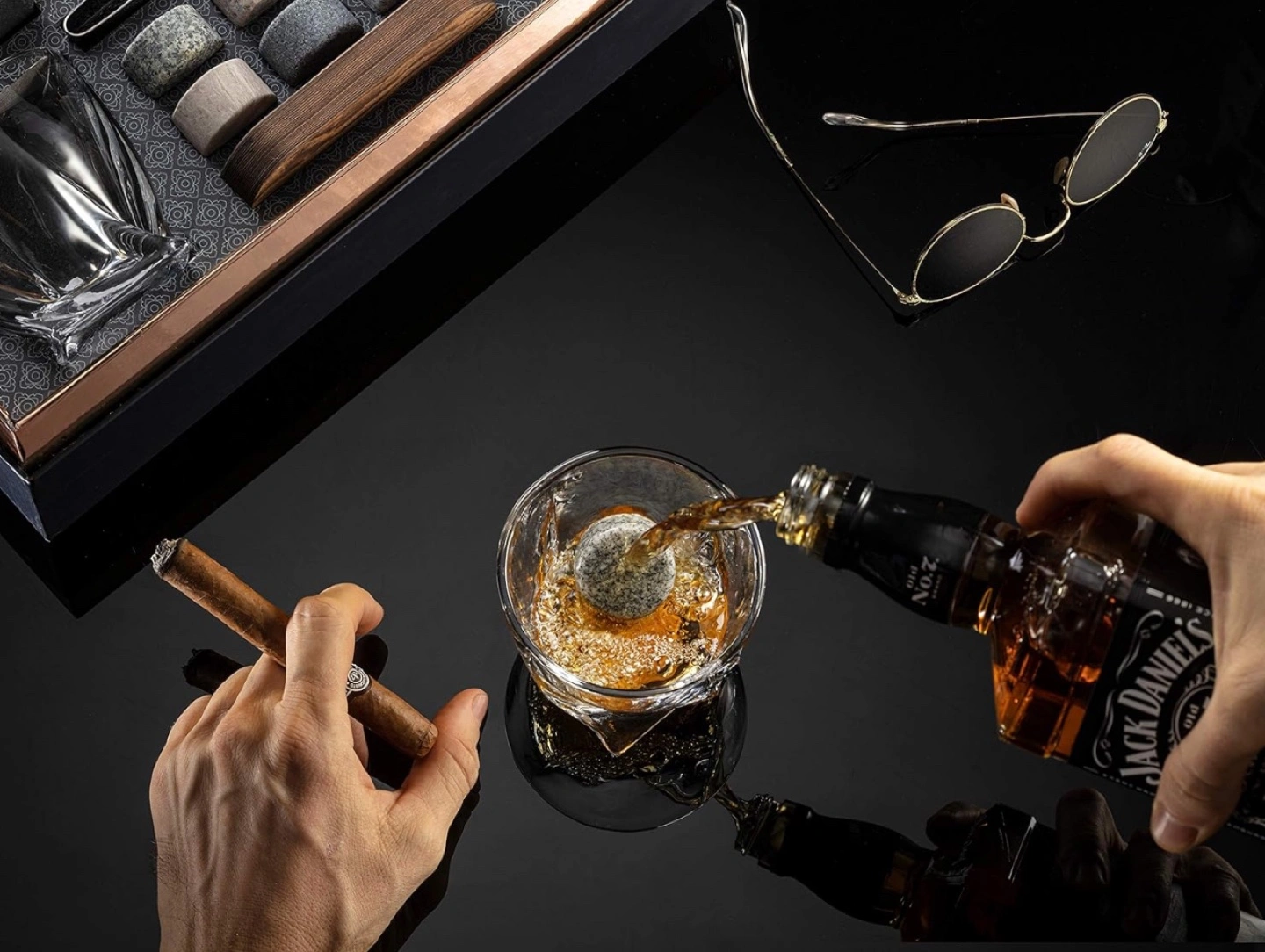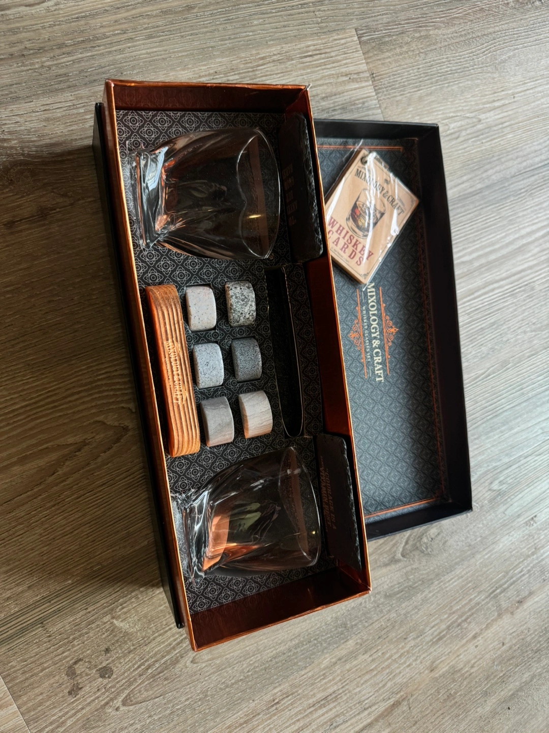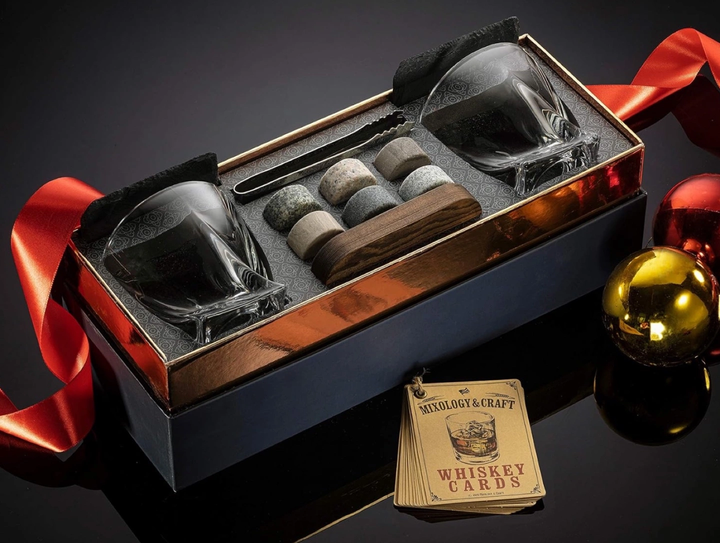 Whiskey glasses, stones, and recipe cards in a gift box. Includes tongs. Whiskey Stones Gift Set for Men | Whiskey Glass and Stones Set with a Classy Gift Box, 6 Granite Round Whiskey Stones and 10oz Whiskey Glasses | Whiskey Lovers Gifts for Men, Dad, Husband, Boyfriend • All-in-one whiskey gift set for strong whiskey fans – perfect for gifting on any occasion • Includes 2 stylish rocks glasses (10oz/300ml) + 6 round 100% natural granite whiskey stones • Features an elegant wood whiskey stone storage tray + metal tongs + 2 slate coasters + whiskey cocktail cards • Keep your drink chilled without melting ice that waters it down – these whiskey stones won’t scratch your glasses • Upgrade your man cave with this attractive and durable whiskey gift set – built to last The Mixology & Craft Whiskey Stones Gift Set is everything a whiskey lover could want and more! With 2 stylish rocks glasses (10oz/300ml), 6 round 100% natural granite whiskey stones, an elegant wood whiskey stone storage tray, metal tongs, 2 slate coasters, and whiskey cocktail cards, this premium-crafted whiskey set is perfect for gifting on any occasion. Keep your drink chilled without melting ice that waters it down with these whiskey stones that won't scratch your glasses. This attractive and durable whiskey gift set is designed to last, and the customer service team is available to assist you 24/7. Upgrade your man cave with this pro-level quality set! This is the perfect whiskey stones gift set for men, whiskey lovers, dad, husband, boyfriend, friends, and family. You can use this whiskey set on any occasion such as Father's Day, Christmas, Valentine’s Day, birthday, graduation, wedding, anniversary, or retirement. Shop with confidence with this whisky gifts for men from Mixology & Craft.