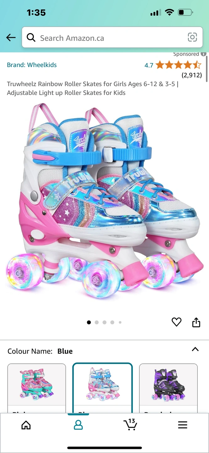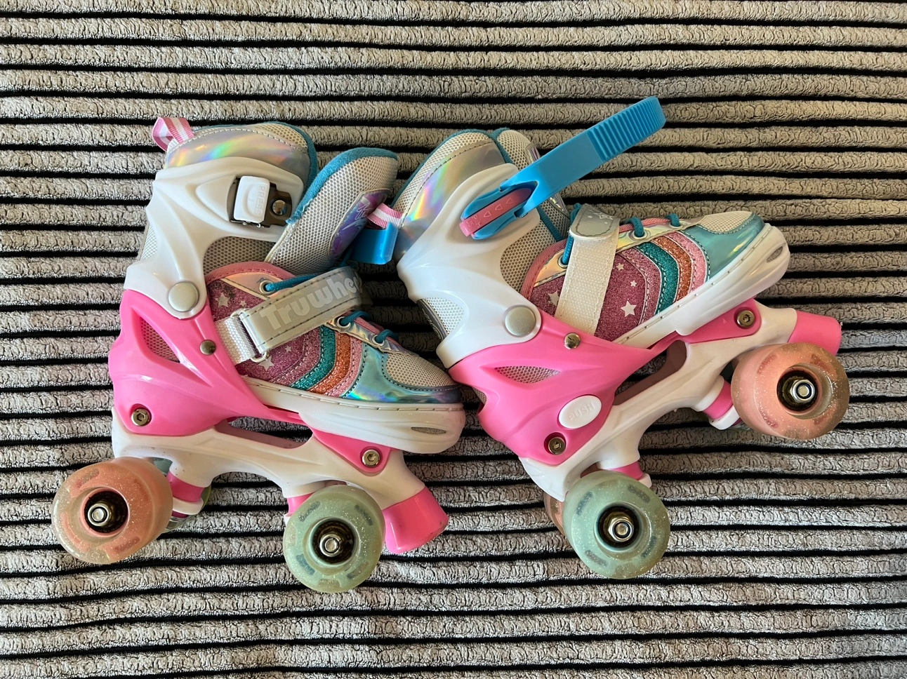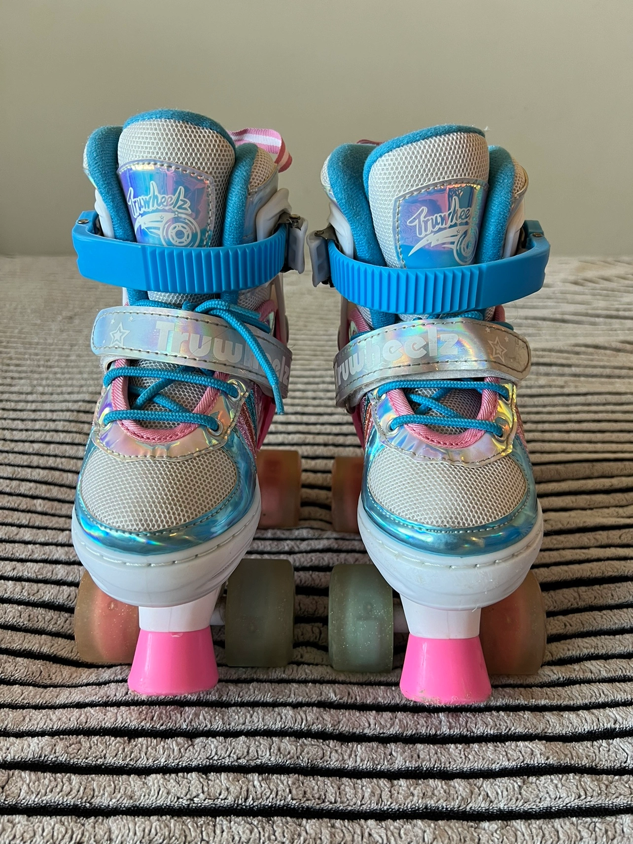 Pink and blue roller skates with light up wheels. Size M. My daughter loved them and took very good care of them.
