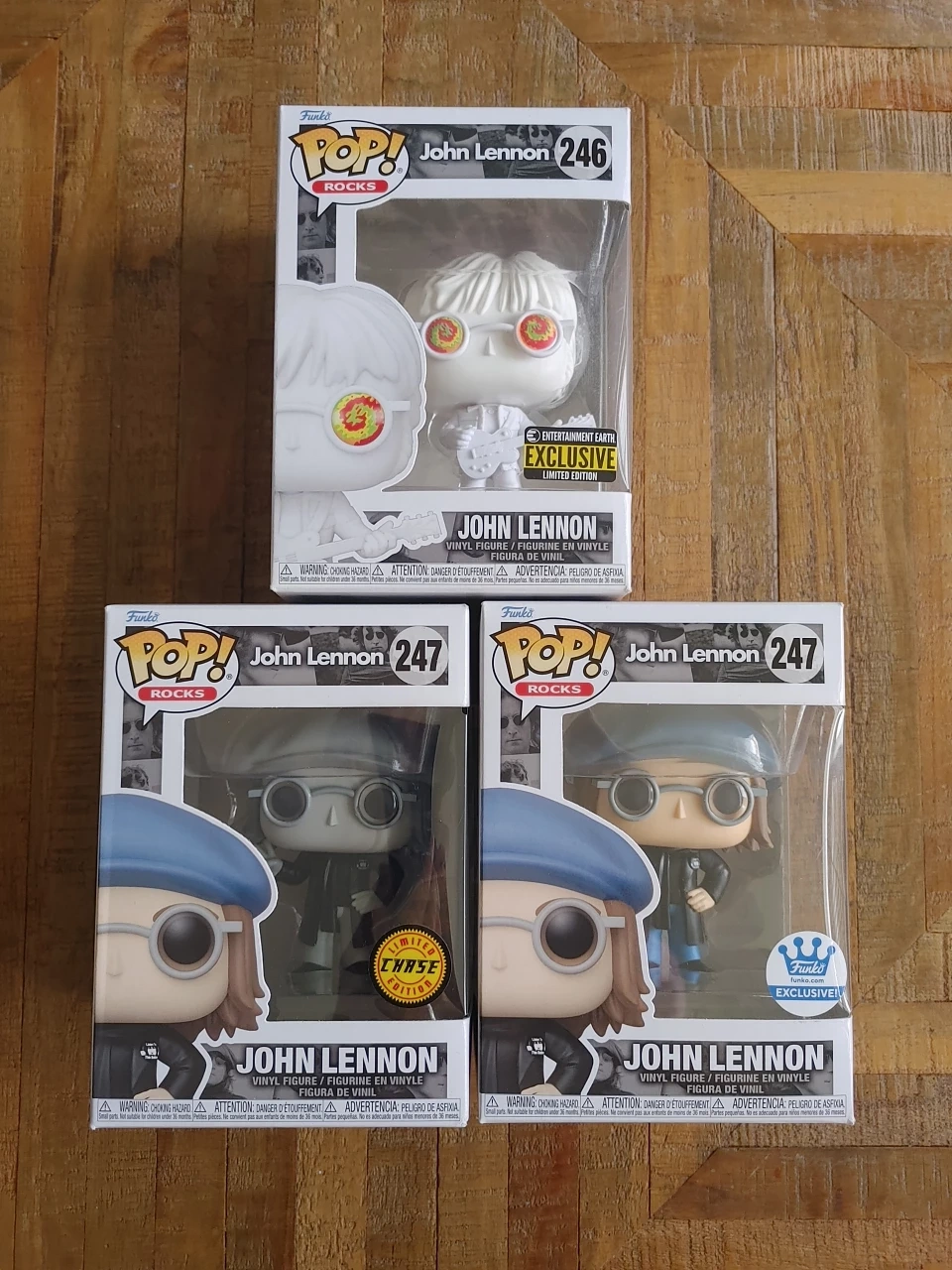 Set of three John Lennon Pop! Vinyl figures. Includes a chase variant and an Entertainment Earth Exclusive. #246 $15 #247 $20 #247 chase 35 all 3 for $60