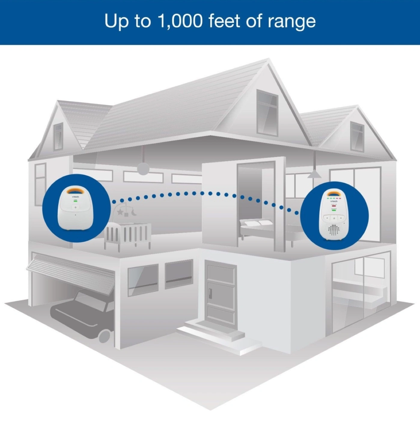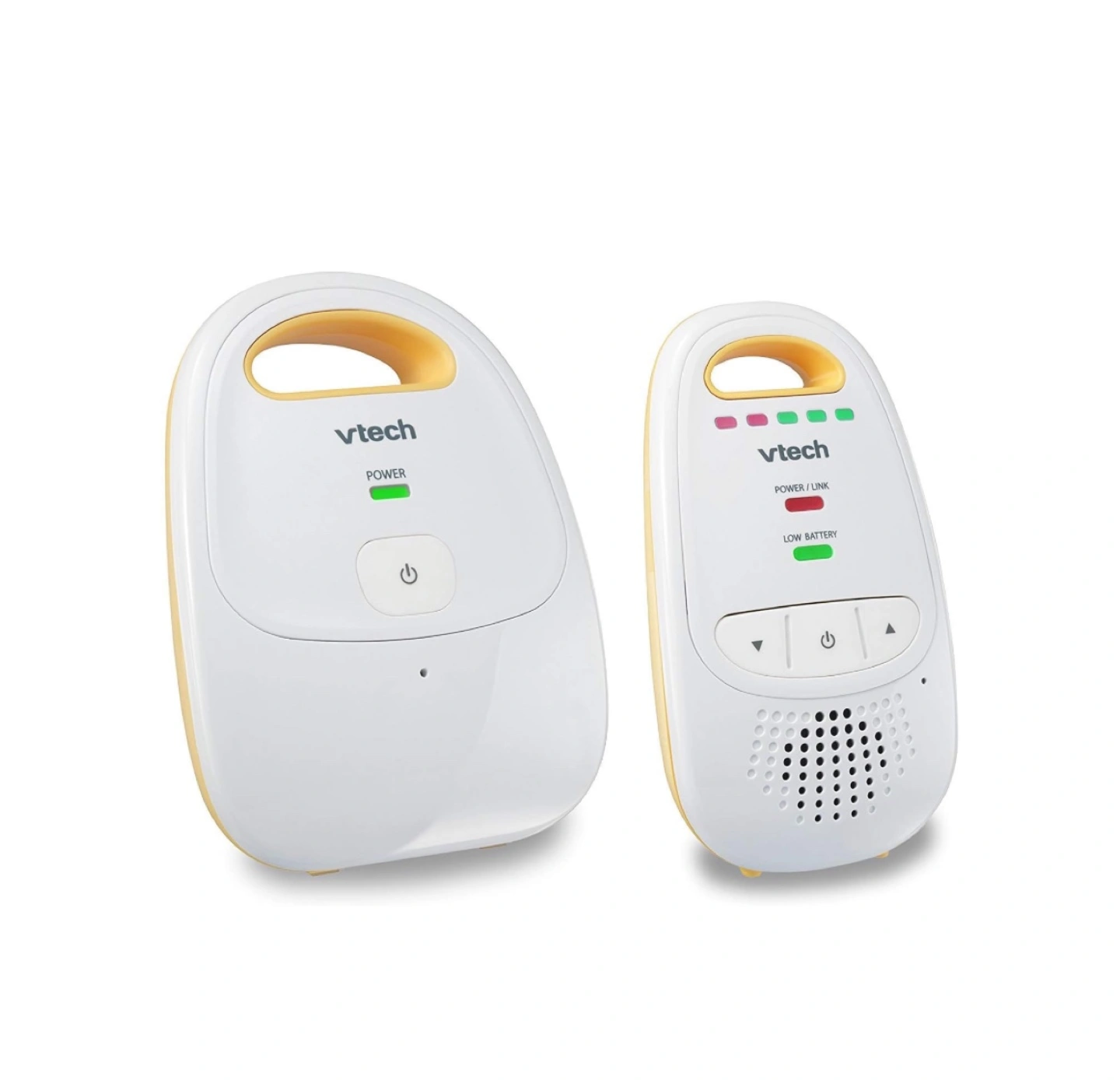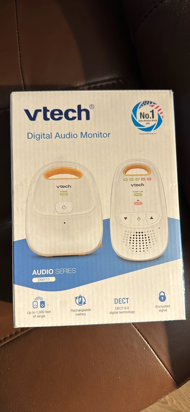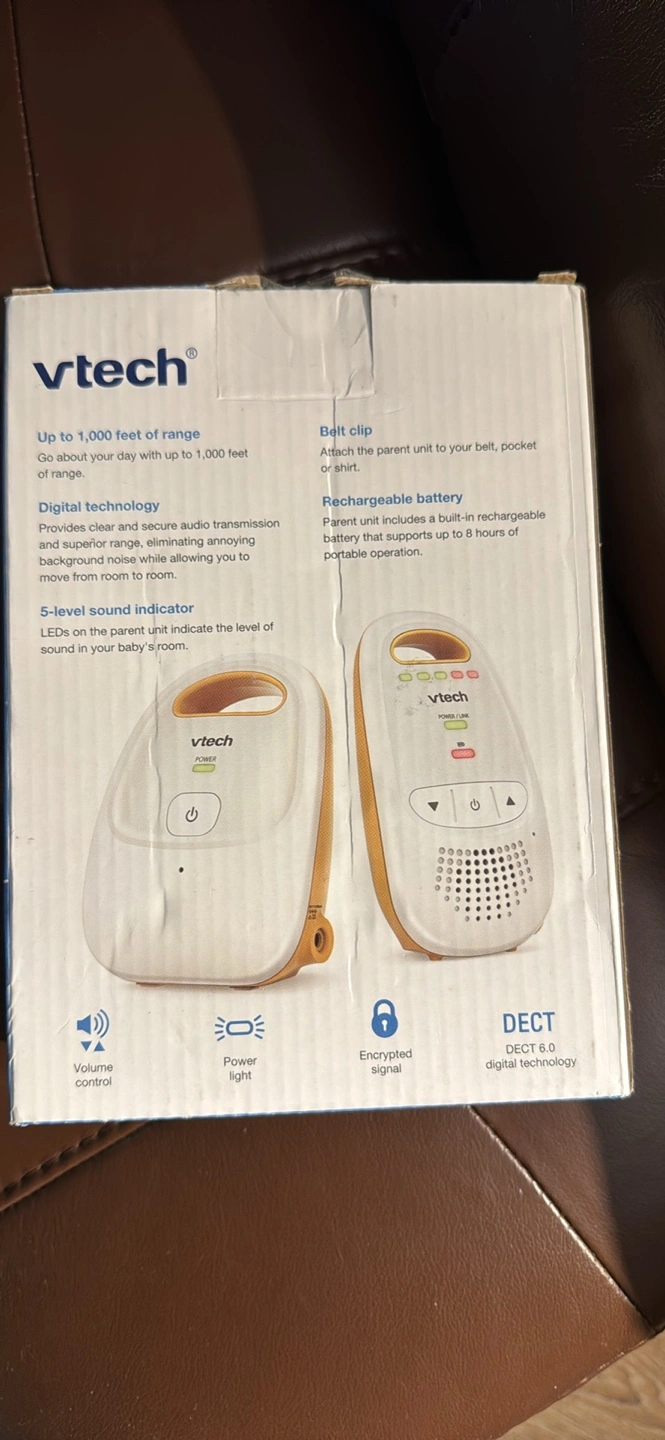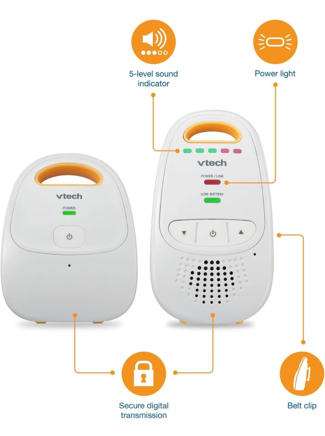 Baby monitor with long range and secure digital transmission. Includes volume control and 5-level sound indicator. Features belt clip. Dect6.0 digital technology for best clarity Data encryption for security Volume control with LED Signal Indicator Lights 1,000 feet range with "Out of range" indicator 2 AAA Batteries (Not Included) - Parent units need two AAA alkaline batteries (not included). Works best with Polaroid AAA batteries. This configuration includes one parent unit (monitor) and one baby unit (audio monitor) - DECT 6.0 provides crystal clear transmission, eliminating the annoying white noise you hear from analog monitors - 5-level sound indicator - graphic bars on the parent unit indicate the level of sound in your baby's room so you can visually monitor the noise level with the unit muted - Belt clip - clip the parent unit to your belt and take advantage of the extended range and battery-powered operation - Parent unit can be set to beep if: (1) link between the parent unit and the baby unit is lost, and/or (2) rechargeable battery is low