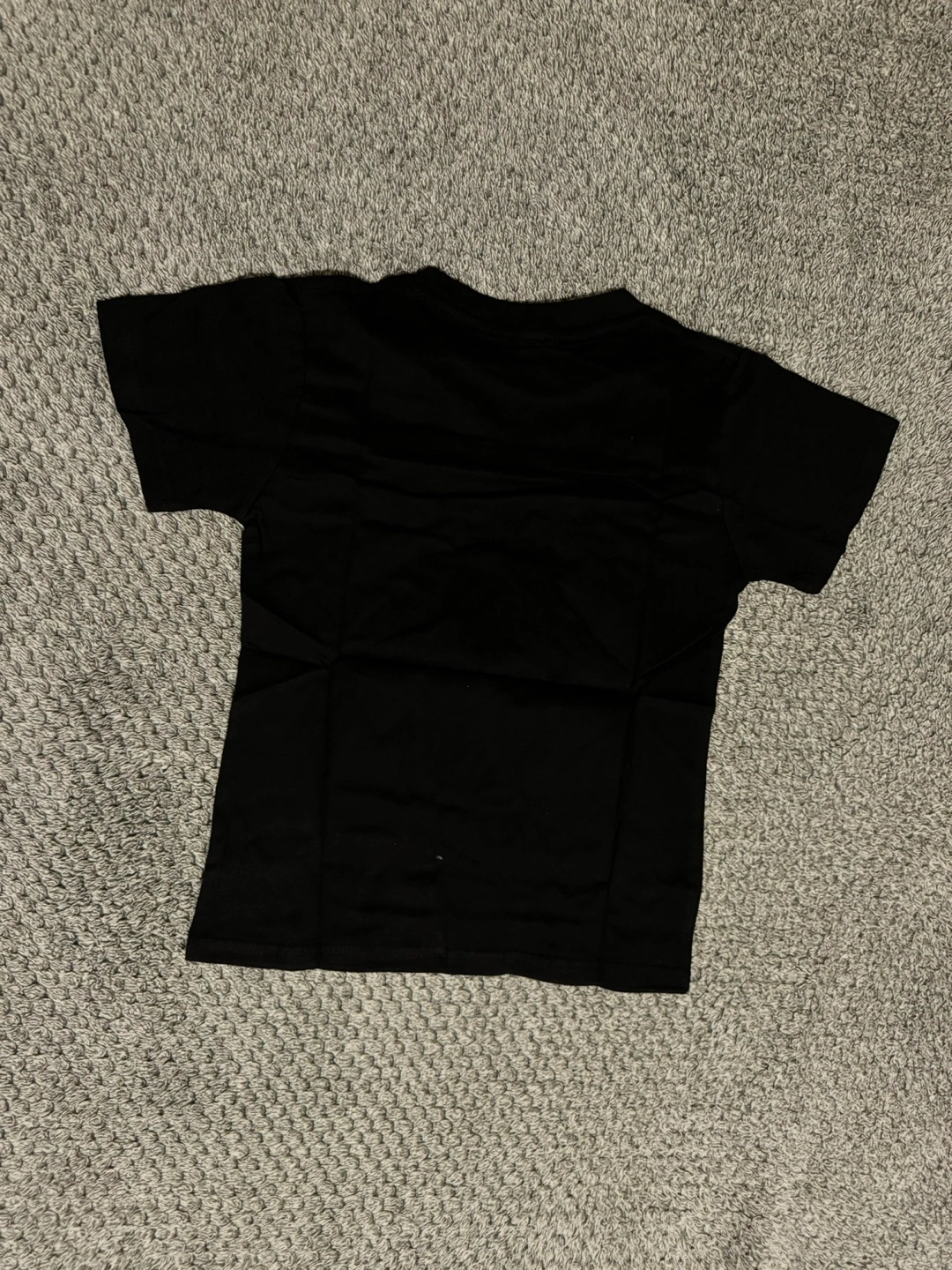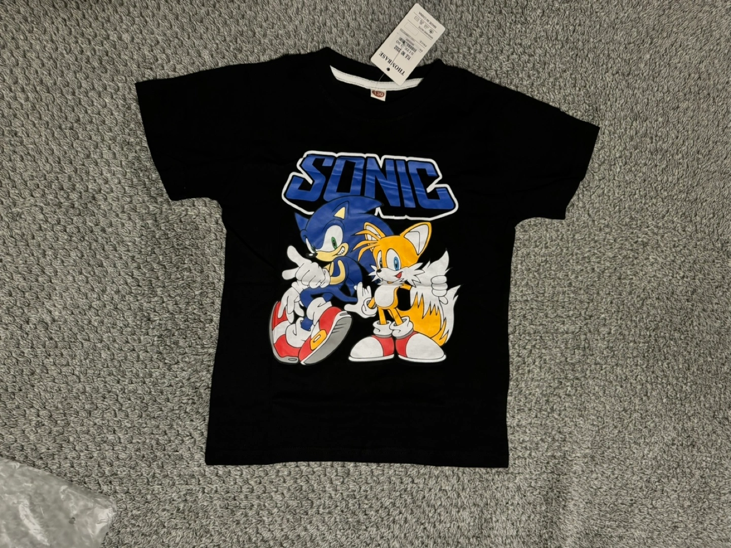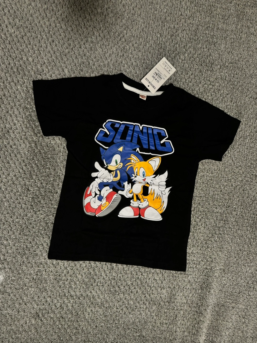 Black short sleeve T-shirt with a graphic of Sonic and Tails. New Length: 19 inches = 48 cm Width: 14 inches = 36 cm