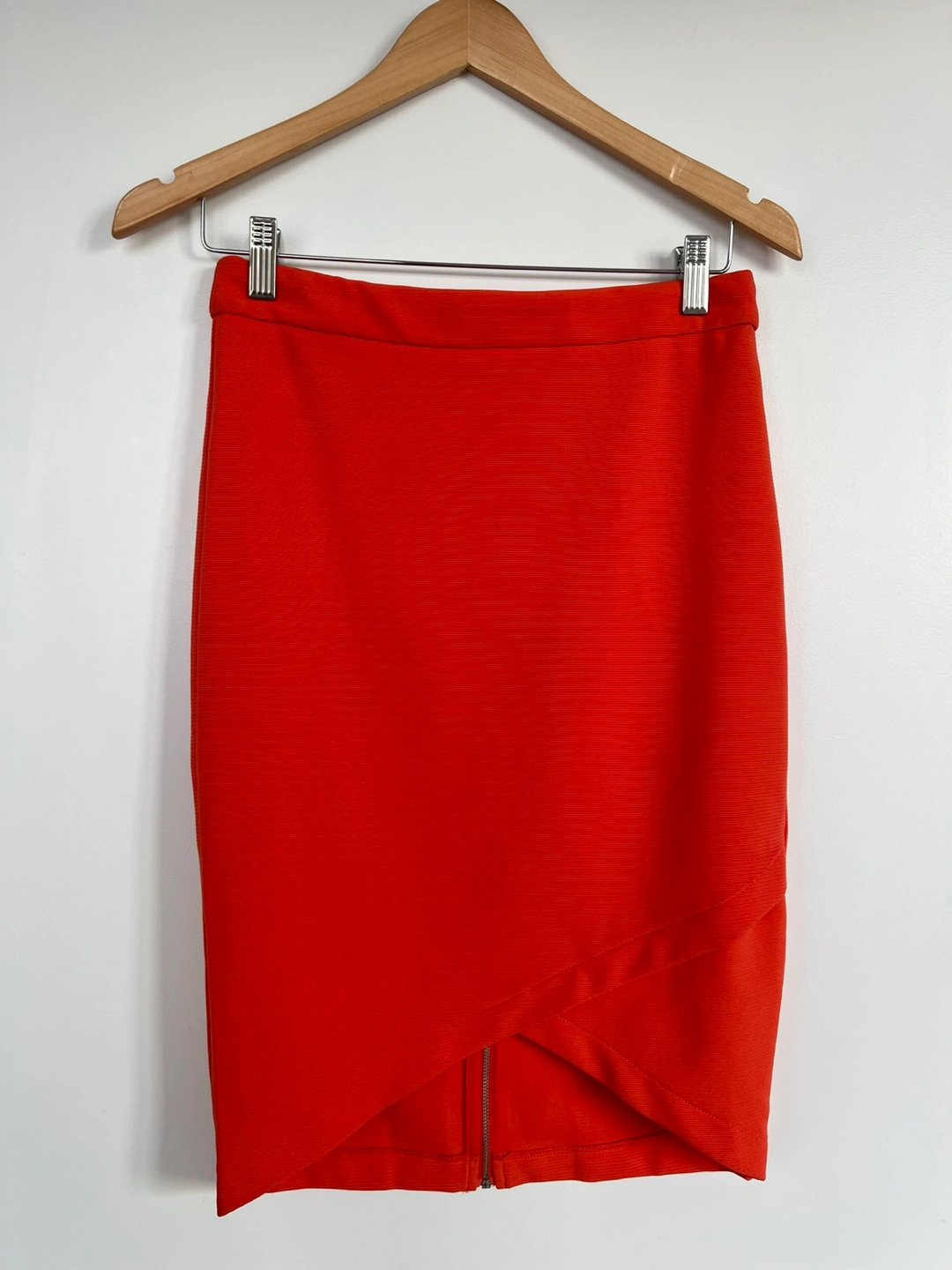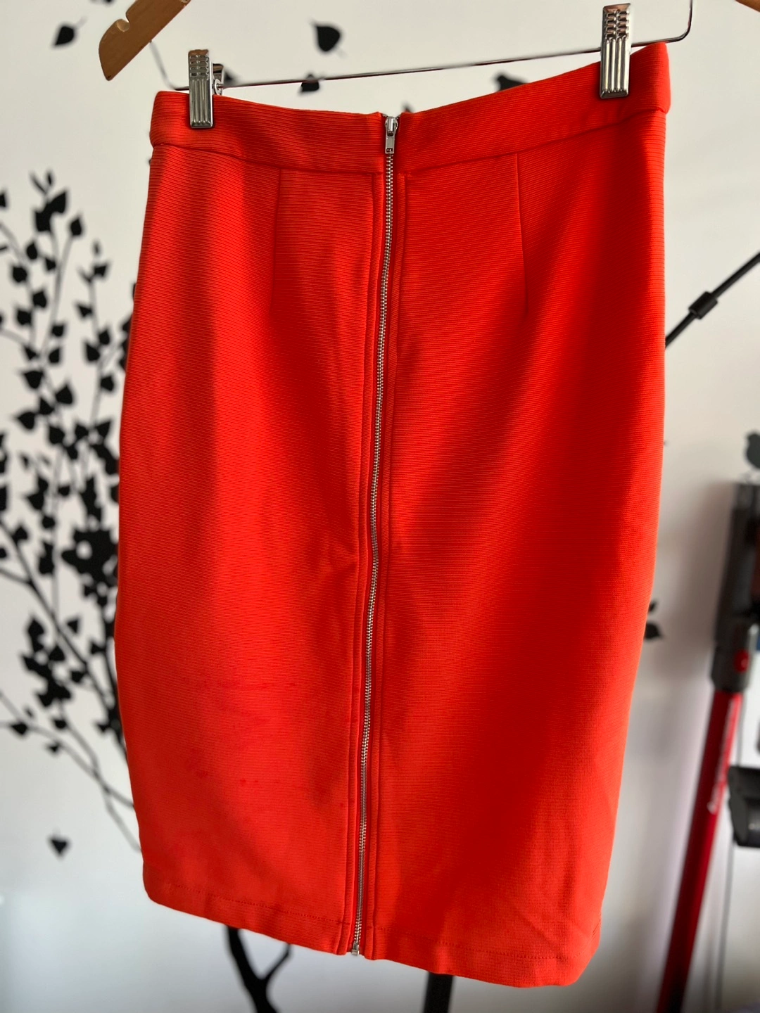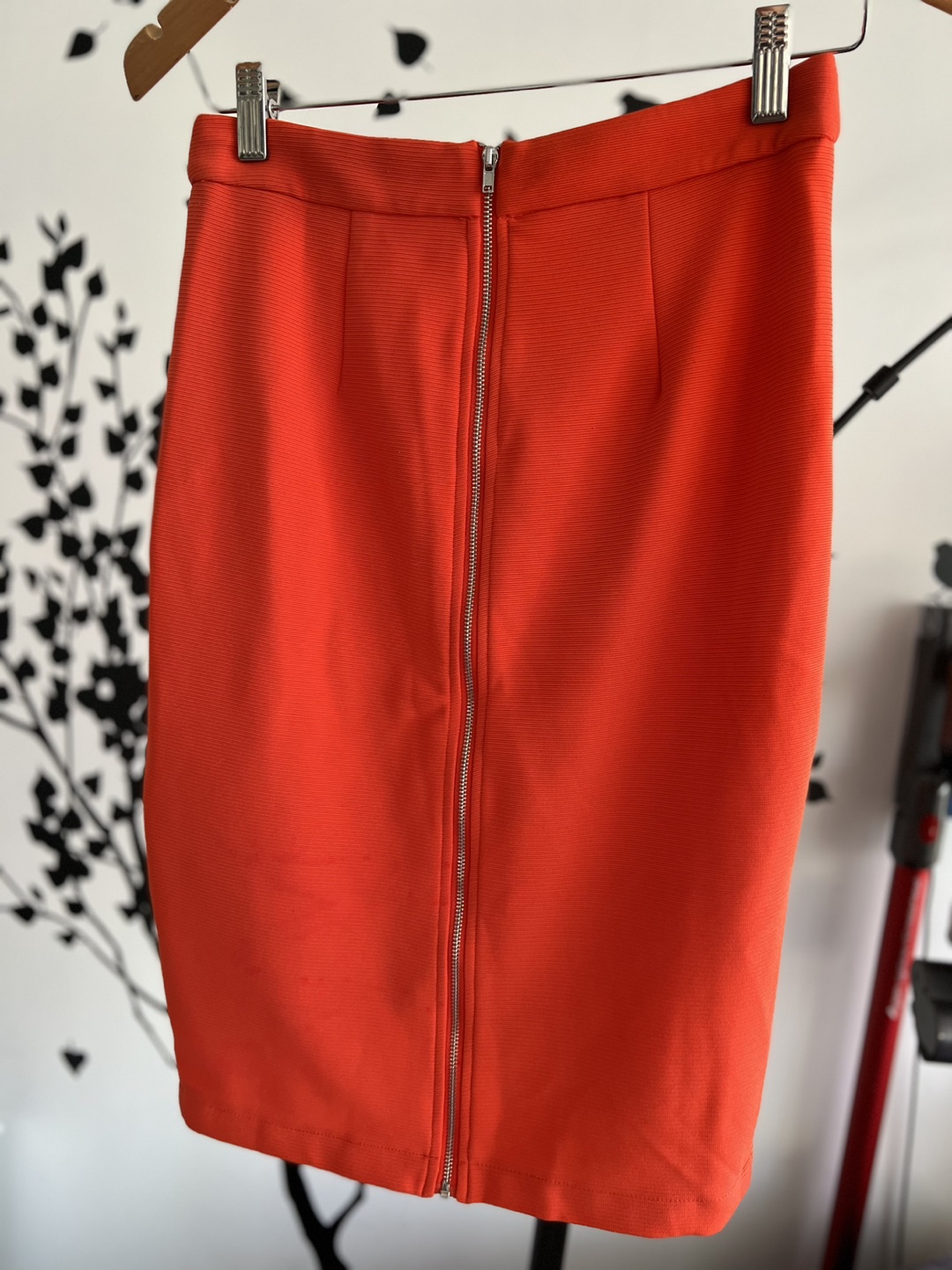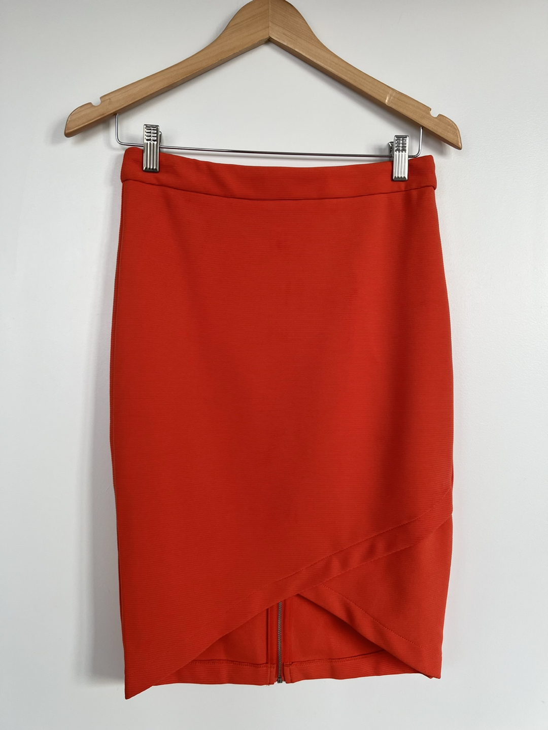 Deep orange colour Jealous Tomato pencil skirt, with crossover design in front and gorgeous full zipper in the back. It’s in very good condition.