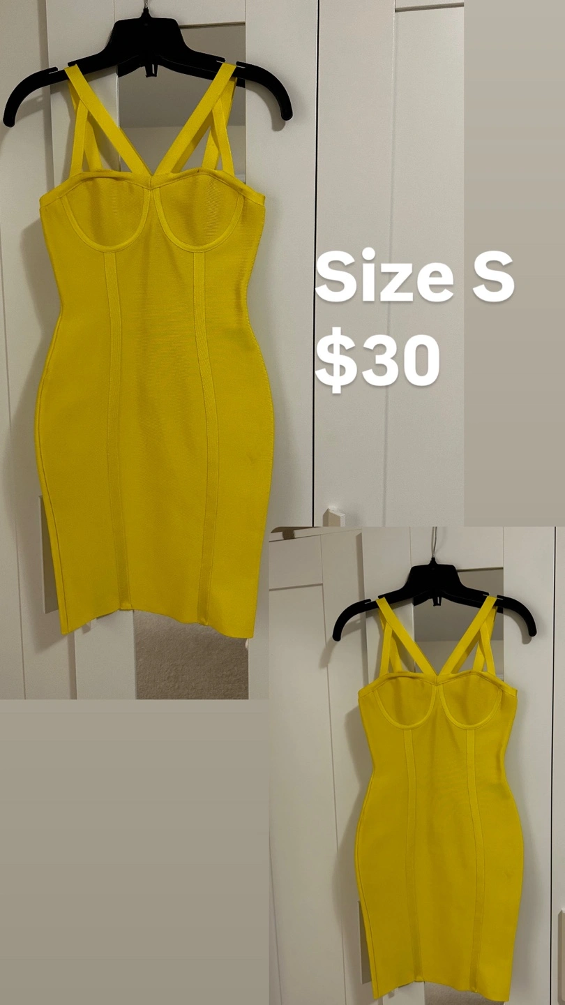 Size S. Yellow sleeveless bodycon dress with a criss cross strap detail at the neckline.