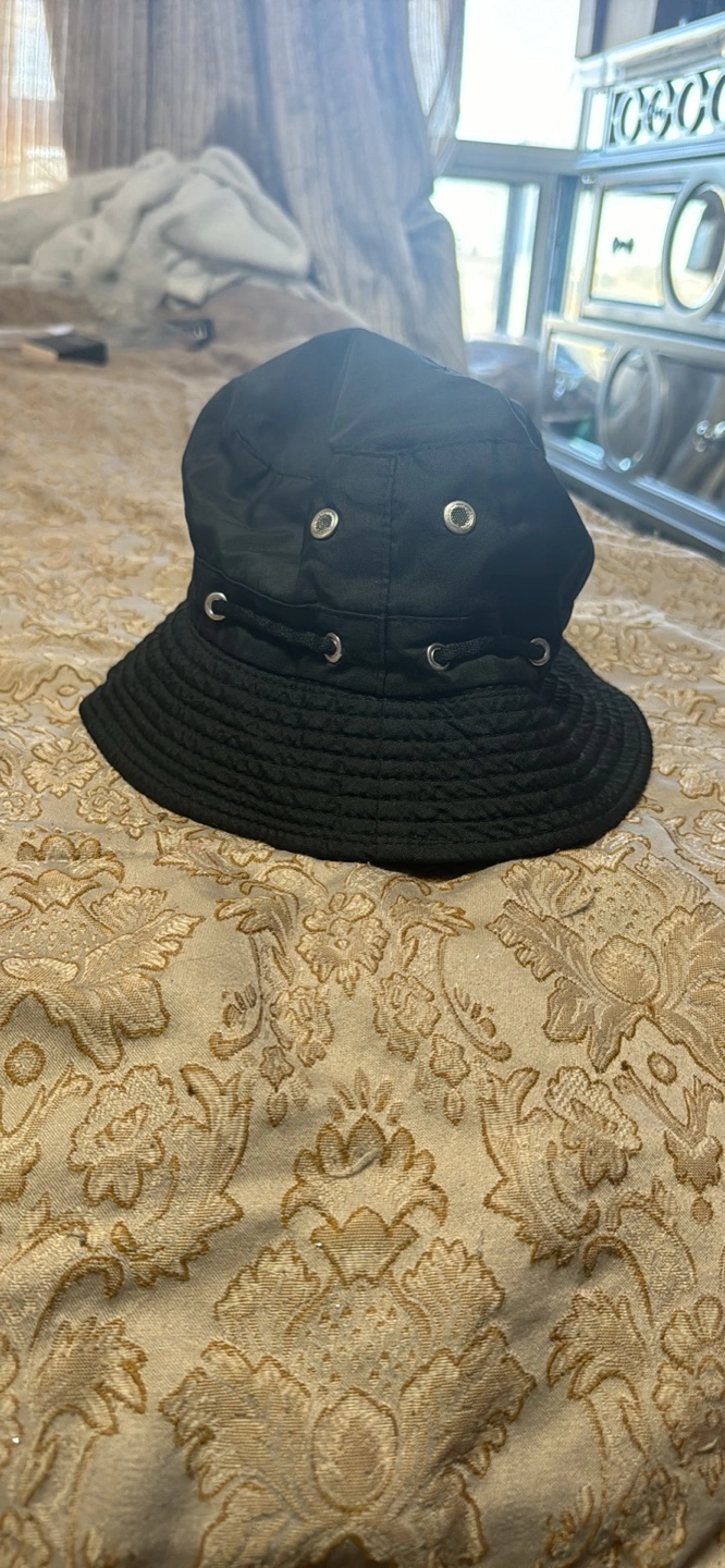 Black bucket hat with adjustable drawstring. Excellent condition.