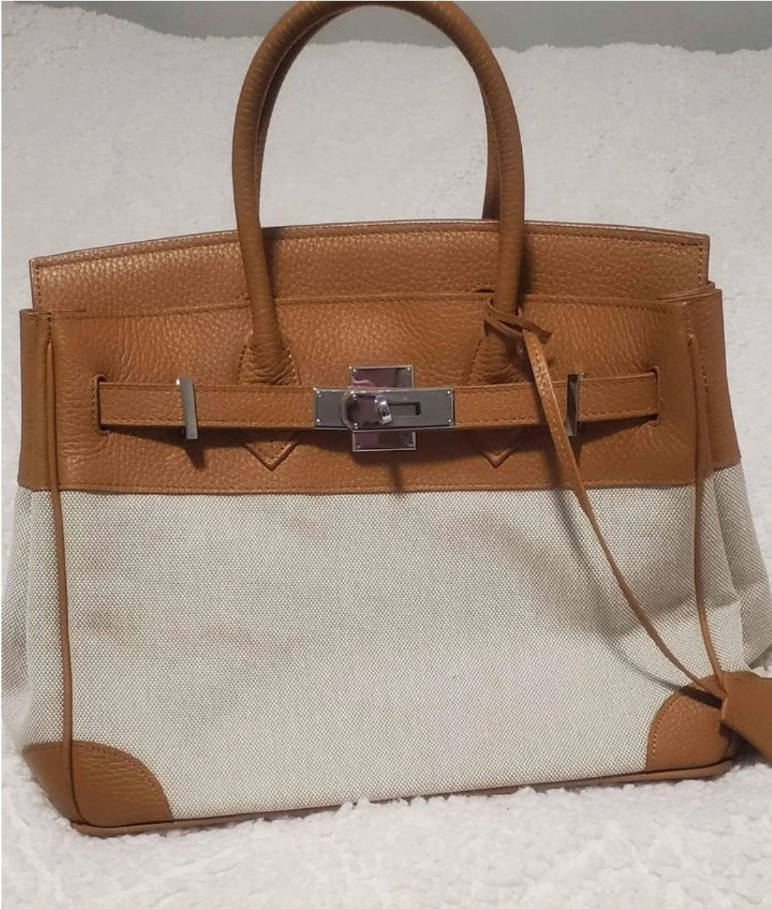 Tan leather handbag with white canvas bottom, silver hardware and two handles.