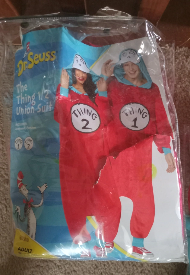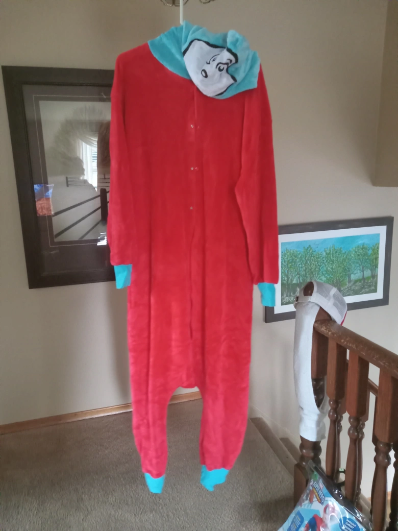 Adult size, red union suit. Features Thing 1 or 2 hood and character printed on the front.