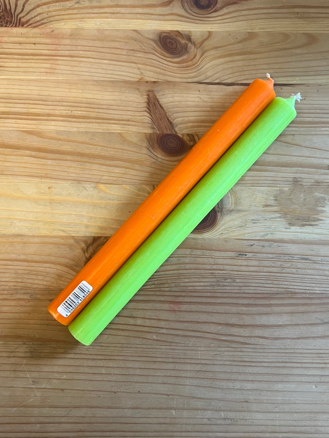 Two tall candles, one green and one orange. They have not been lit. purchased at Wildly Delicious ๐ฅ Height 7.5โ Diameter 0.6โ
