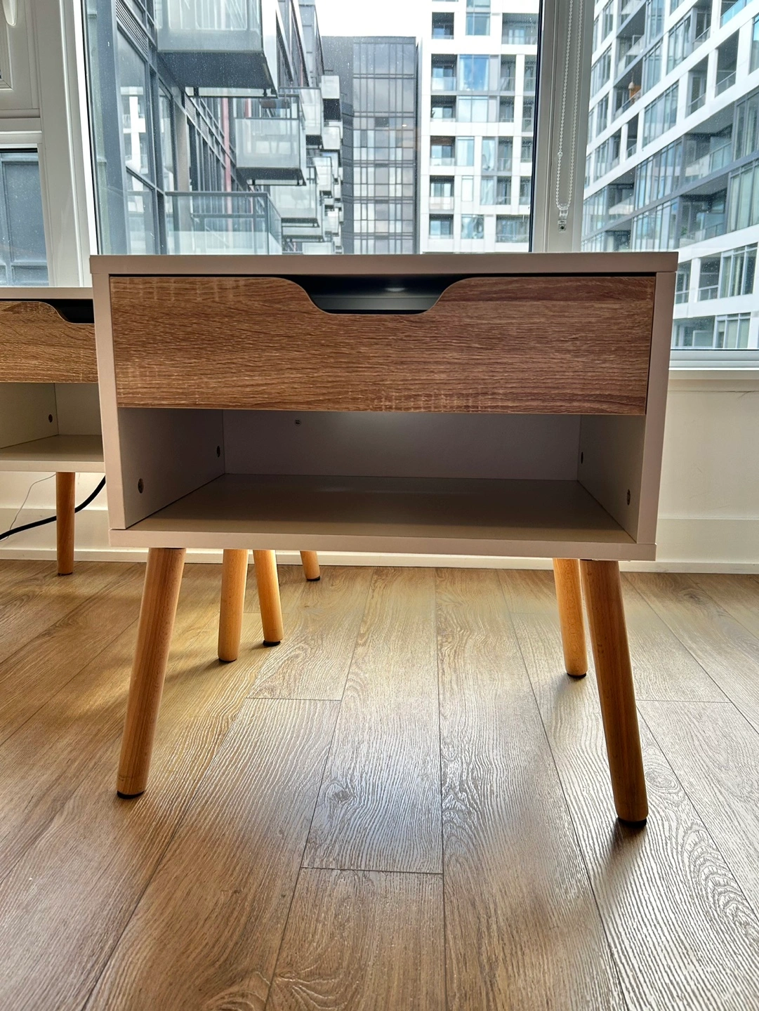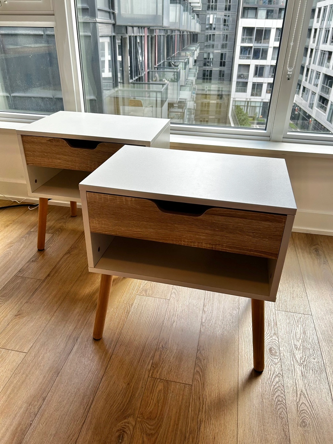 Pair of nightstands with wooden legs and a drawer. White finish with a wooden drawer front. Used less than a year, mint condition. 50 each or 90 both Measurements 13,5x20x20 inch