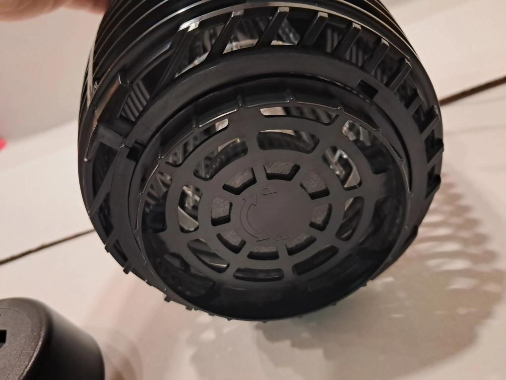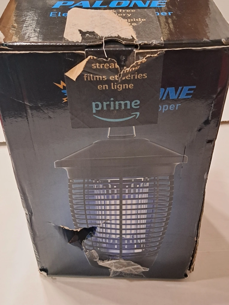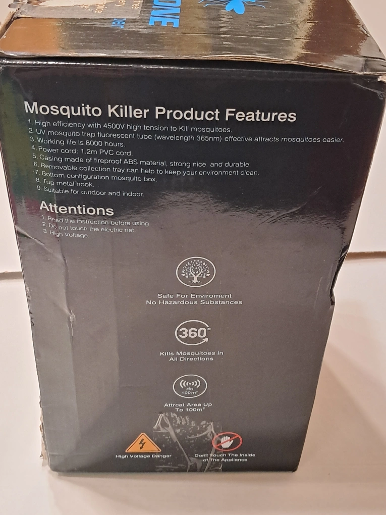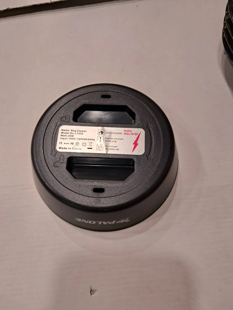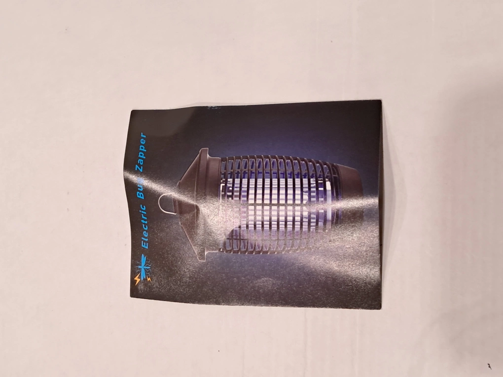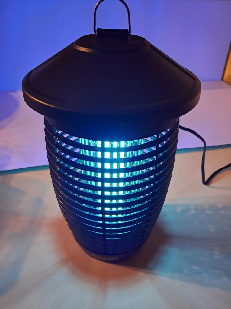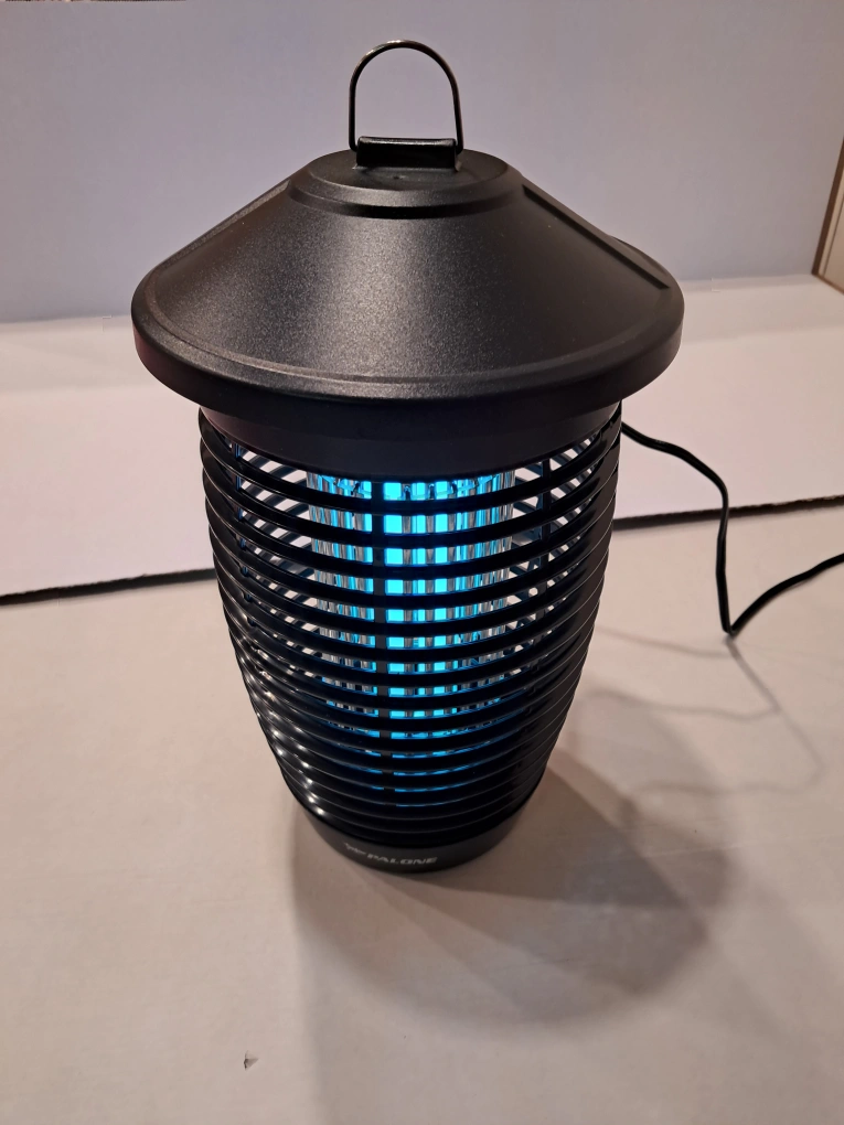 Black electric bug zapper with a blue light and a cord. Indoor/outdoor.