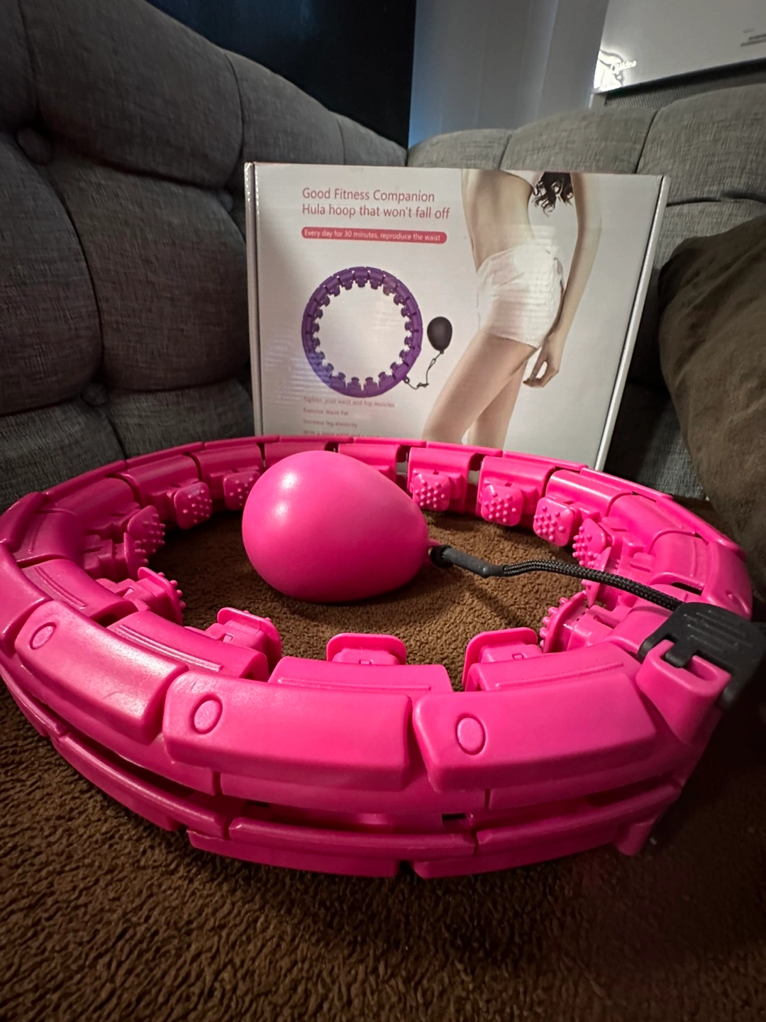 Pink hula hoop with weighted ball. Hula hoop is segmented and has a cord for added security.