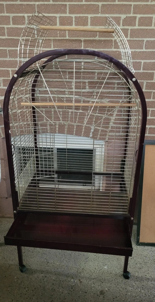 Large bird cage with a curved top and a bottom tray that pulls out. Includes two wooden perches Has wheels to move the cage around. burgundy color 401 and islington ave