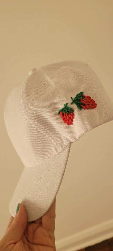 White baseball cap with embroidered strawberries and flowers. Adjustable. Yonge and Finch area