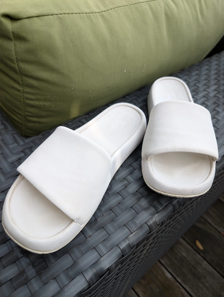 Very comfortable white slide shoes with a plush feel.Perfect for casual wear, the beach, or simply lounging around. Solid grip . Provides major support .Gently used. Please review both outdoor and indoor photos as the photo of the model to get a better idea. ๐๐๐๐ปโจ๏ธ๐ฅ๐๐๏ธ