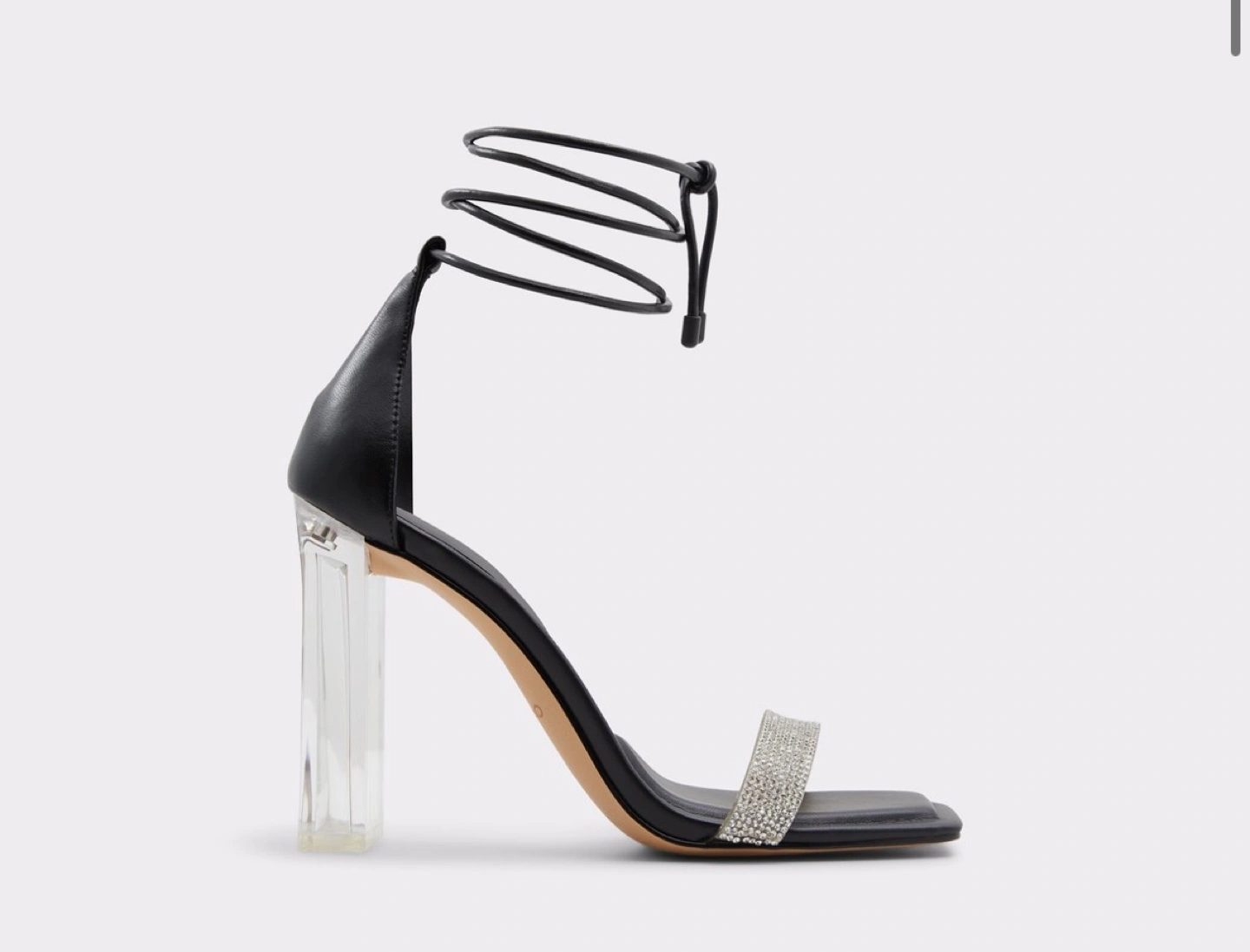 Black heeled sandals with clear block heel and rhinestone embellishment. Lace-up ankle strap. Size 6.5. Brand new with box.