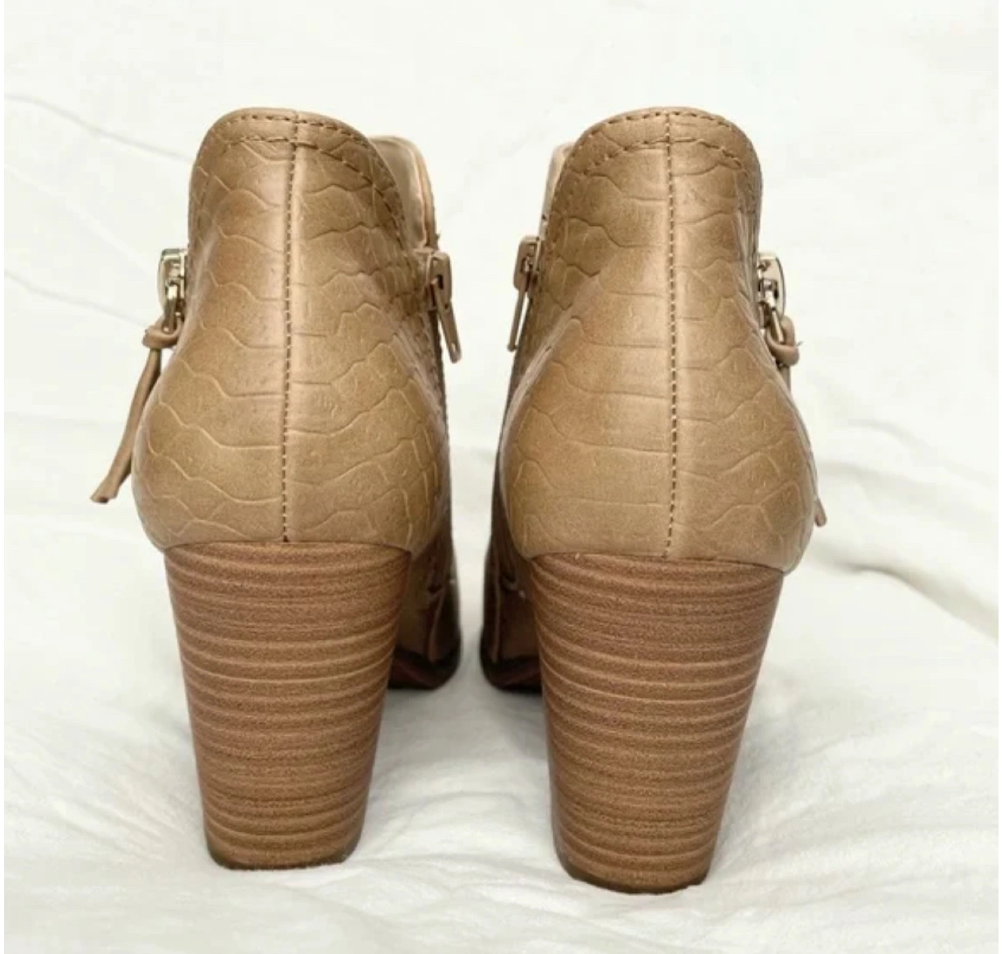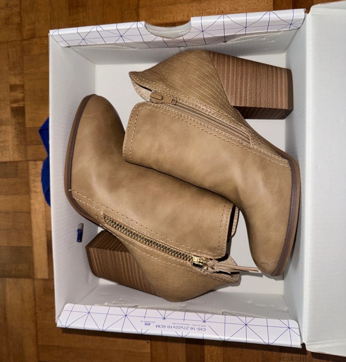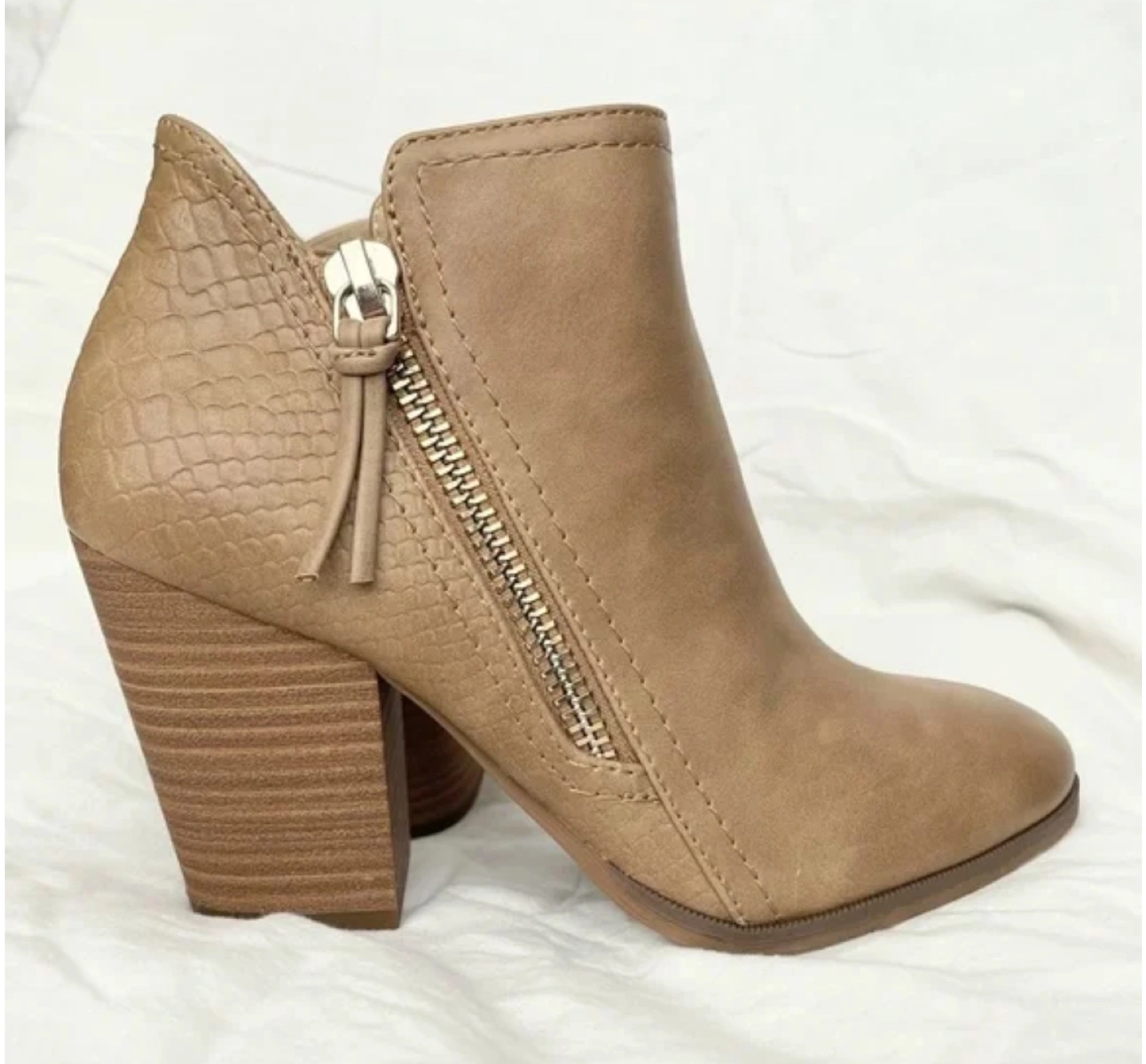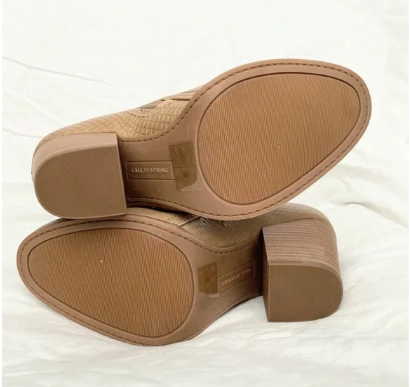 Brand new Vegan leather boots from Call It Spring size 7. Almond toe, snake skin texture on the heel and decorative gold outside zipper with tassel. Inner zipper opens to put on the boots and is the same color as the boot material to blend in easily. Wood-look block heel. These are the perfect wardrobe staple and go with everything. Classic cream/tan color.