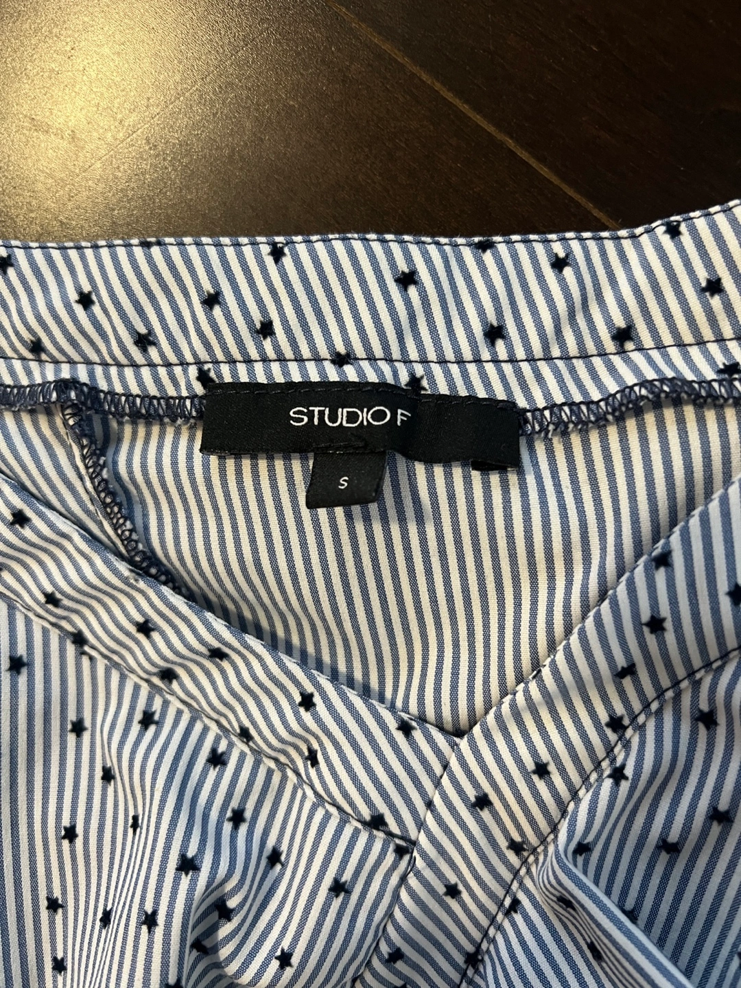 Striped top with star pattern and blue trim. One shoulder style. Size small. Colombian brand: Studio F Pick up only